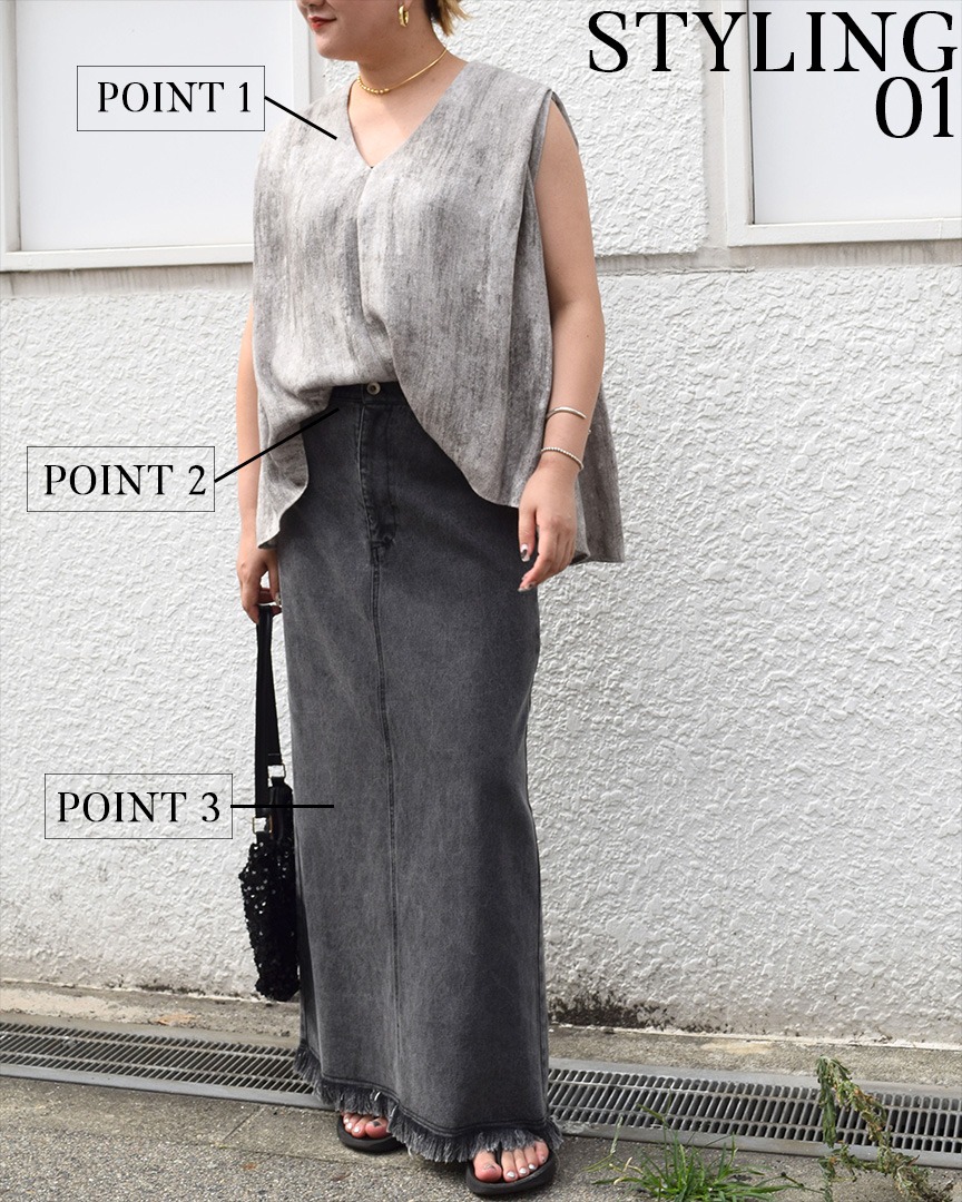 タックインすることでボリュームのあるノースリーブアイテムもスッキリ着こなし💫