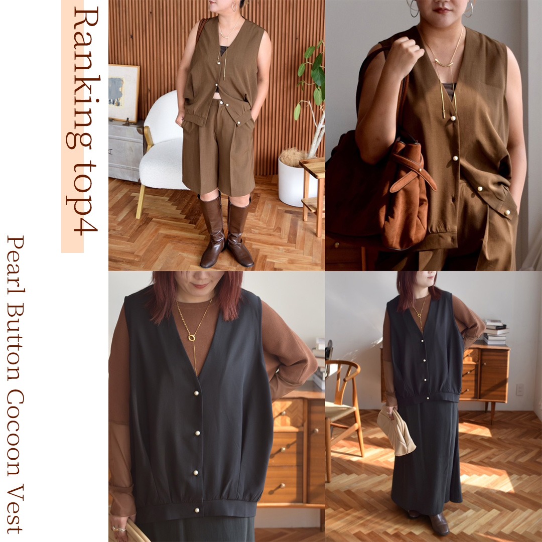 立体感のあるコクーンシルエットに、パール釦が上品さを添えるベスト。