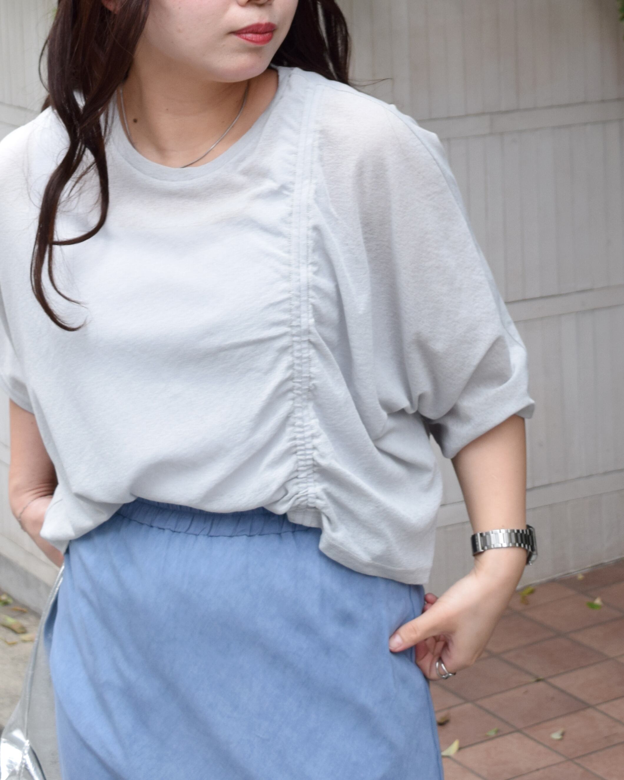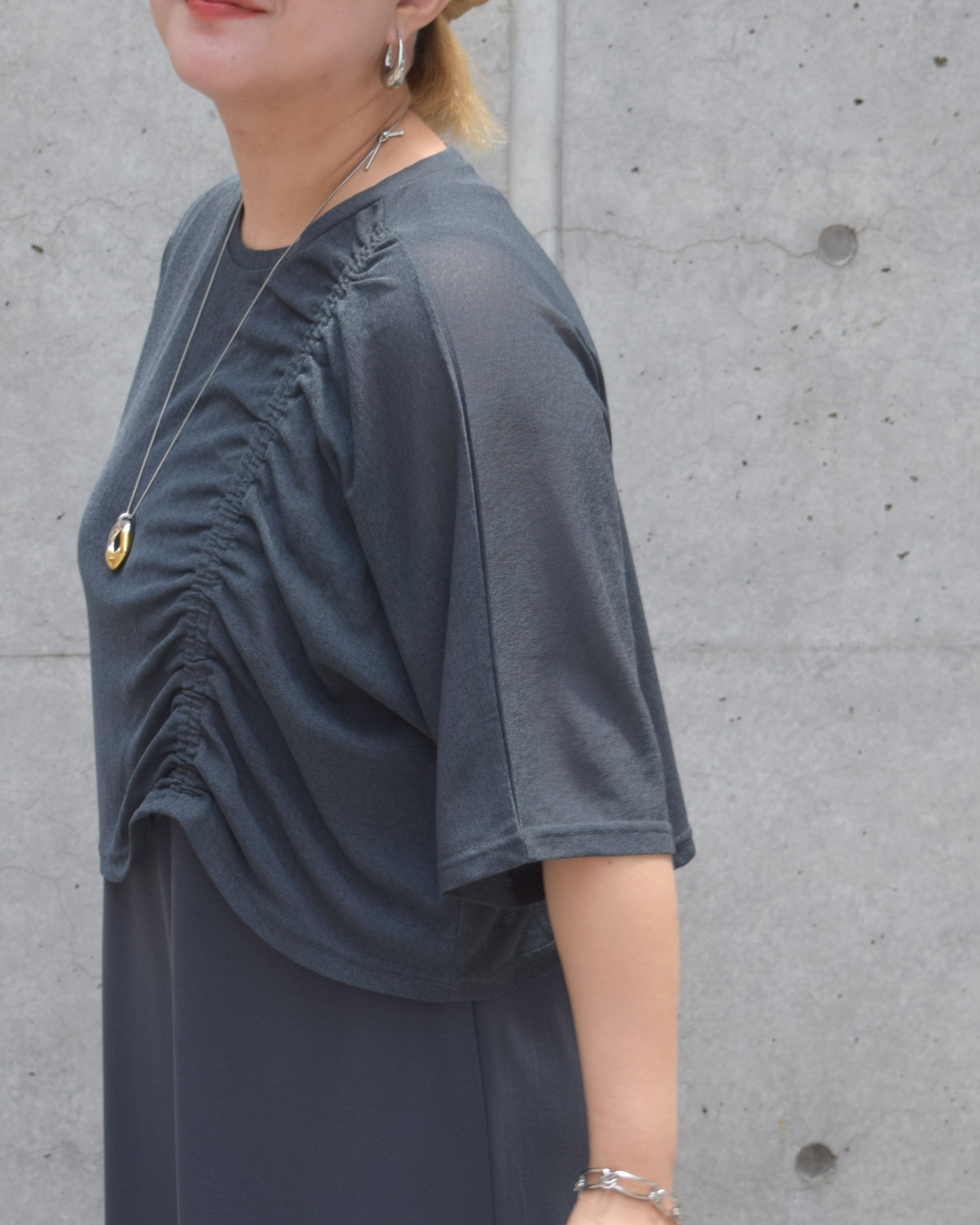 トップスは優しい透け感で少し短めの着丈。フロント部分のシャーリングがポイントです。