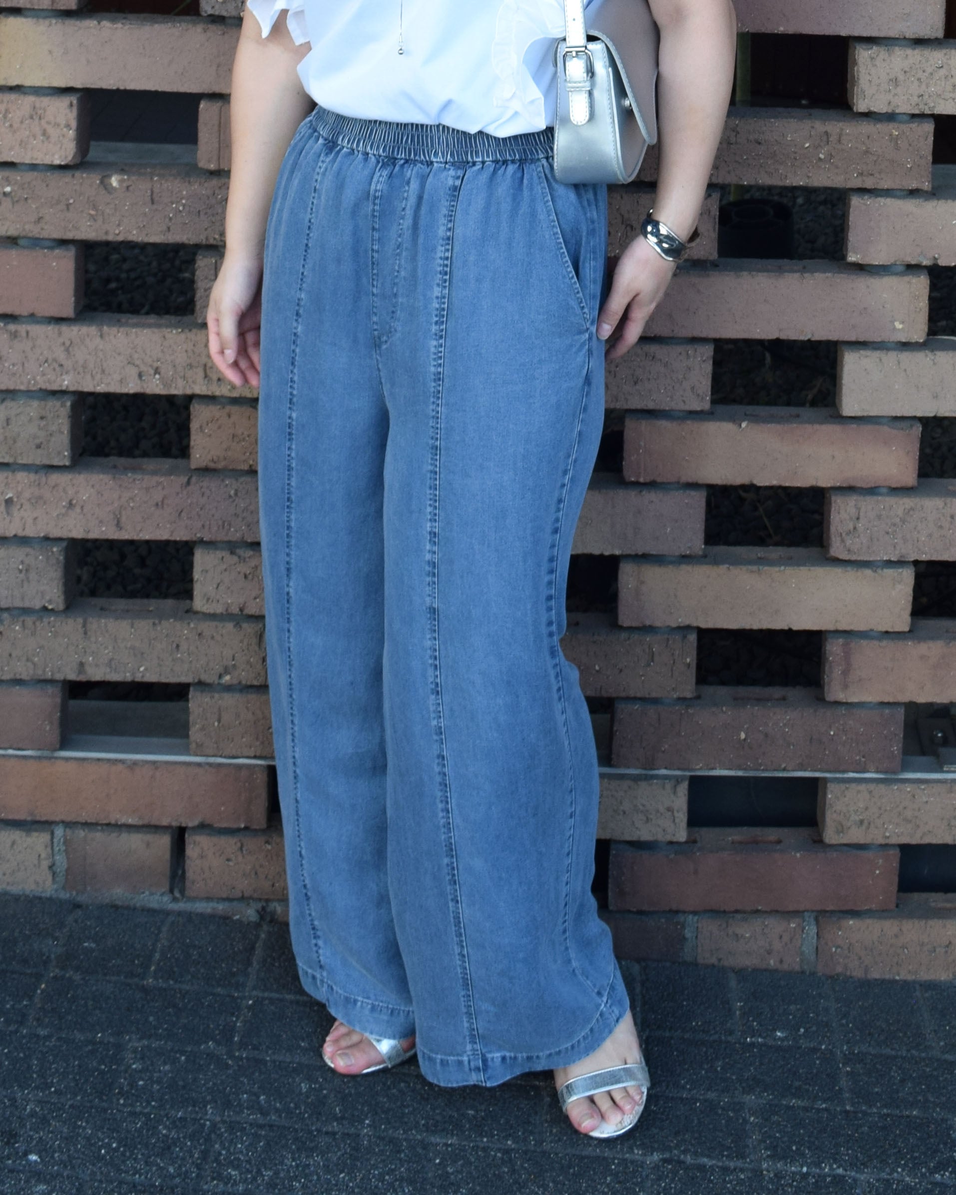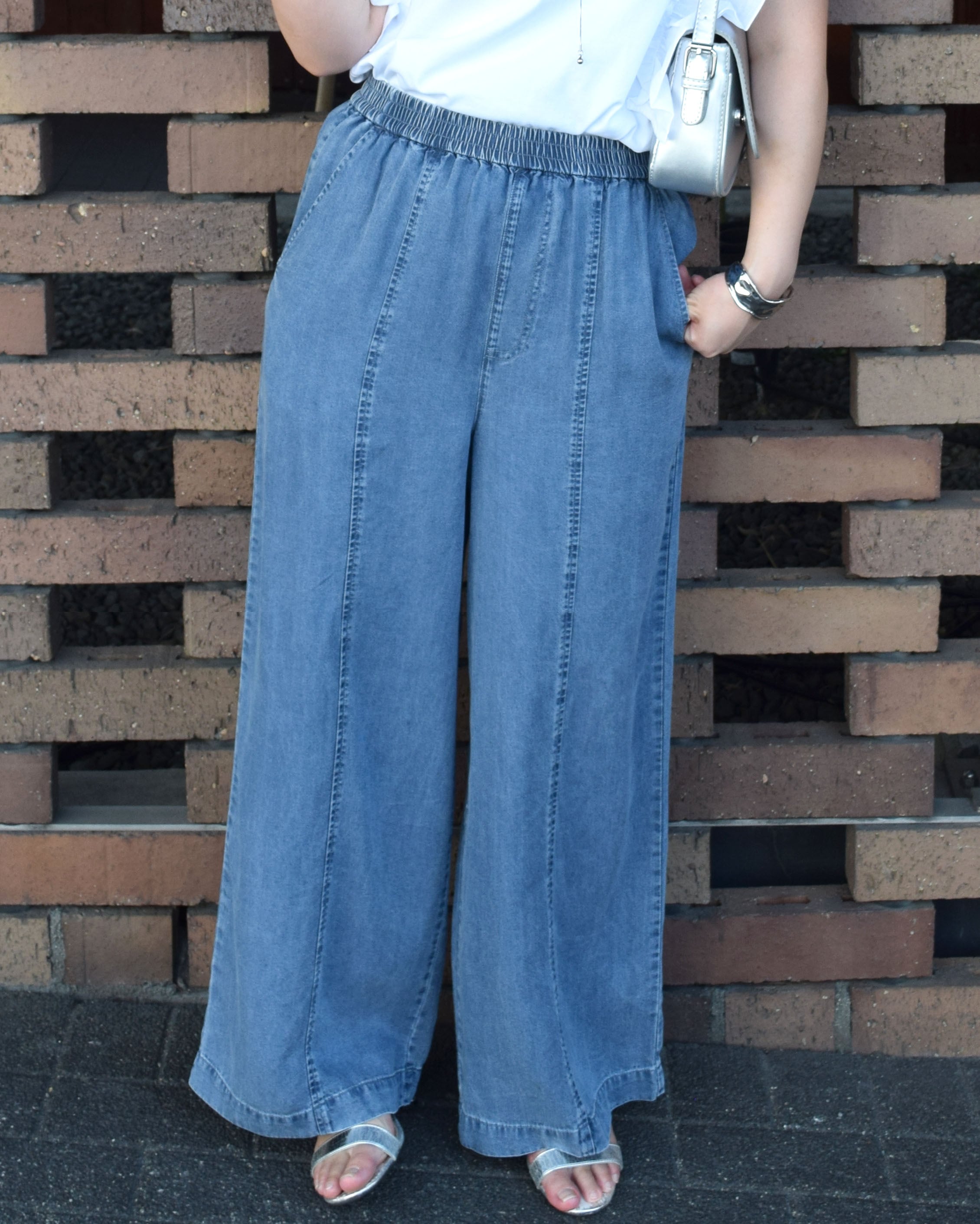 ウエストは総ゴム仕様でリラックス感たっぷり。ほどよい落ち感と縦ラインの切替デザインが、脚をすっきりと見せてくれます。