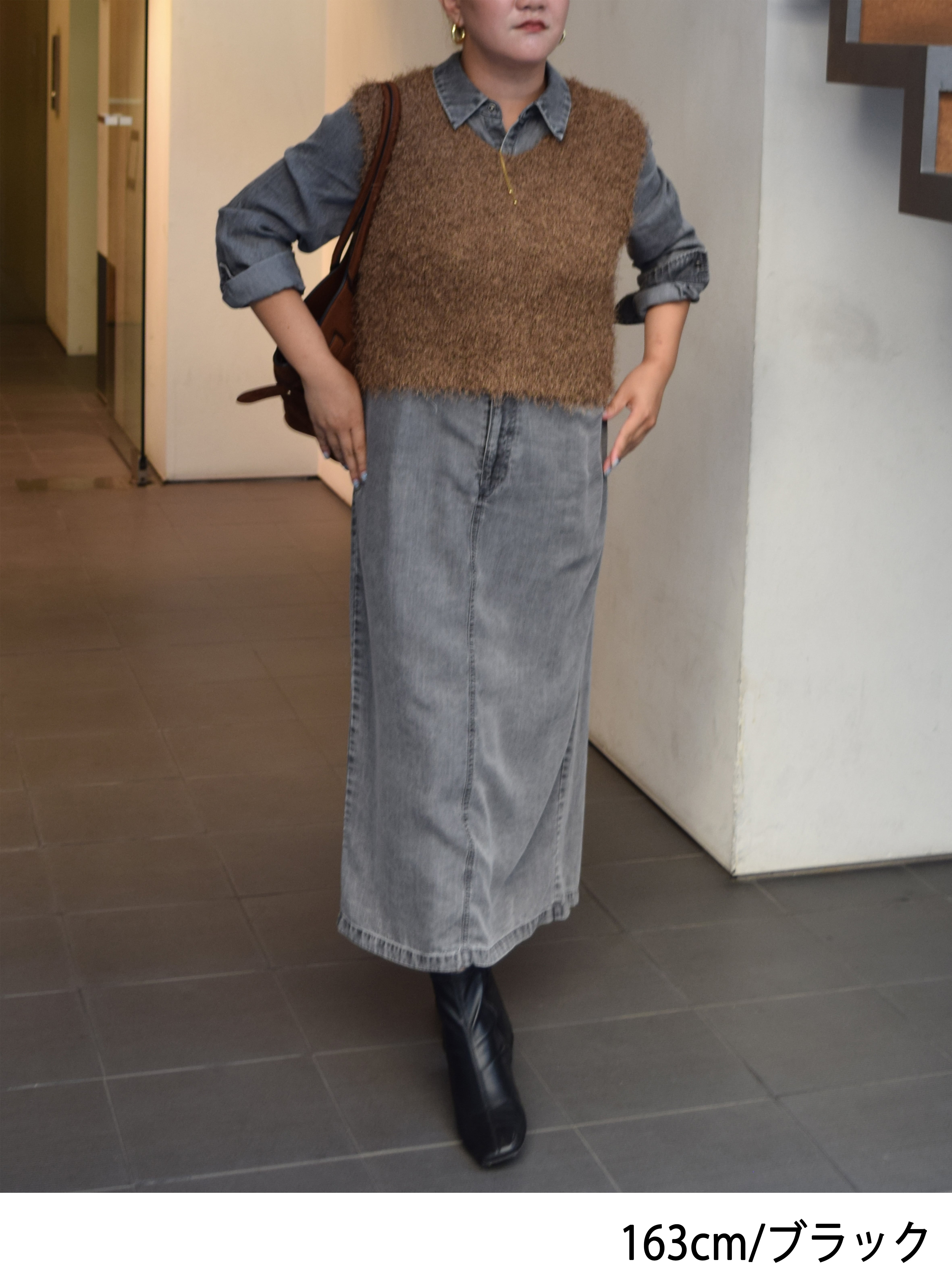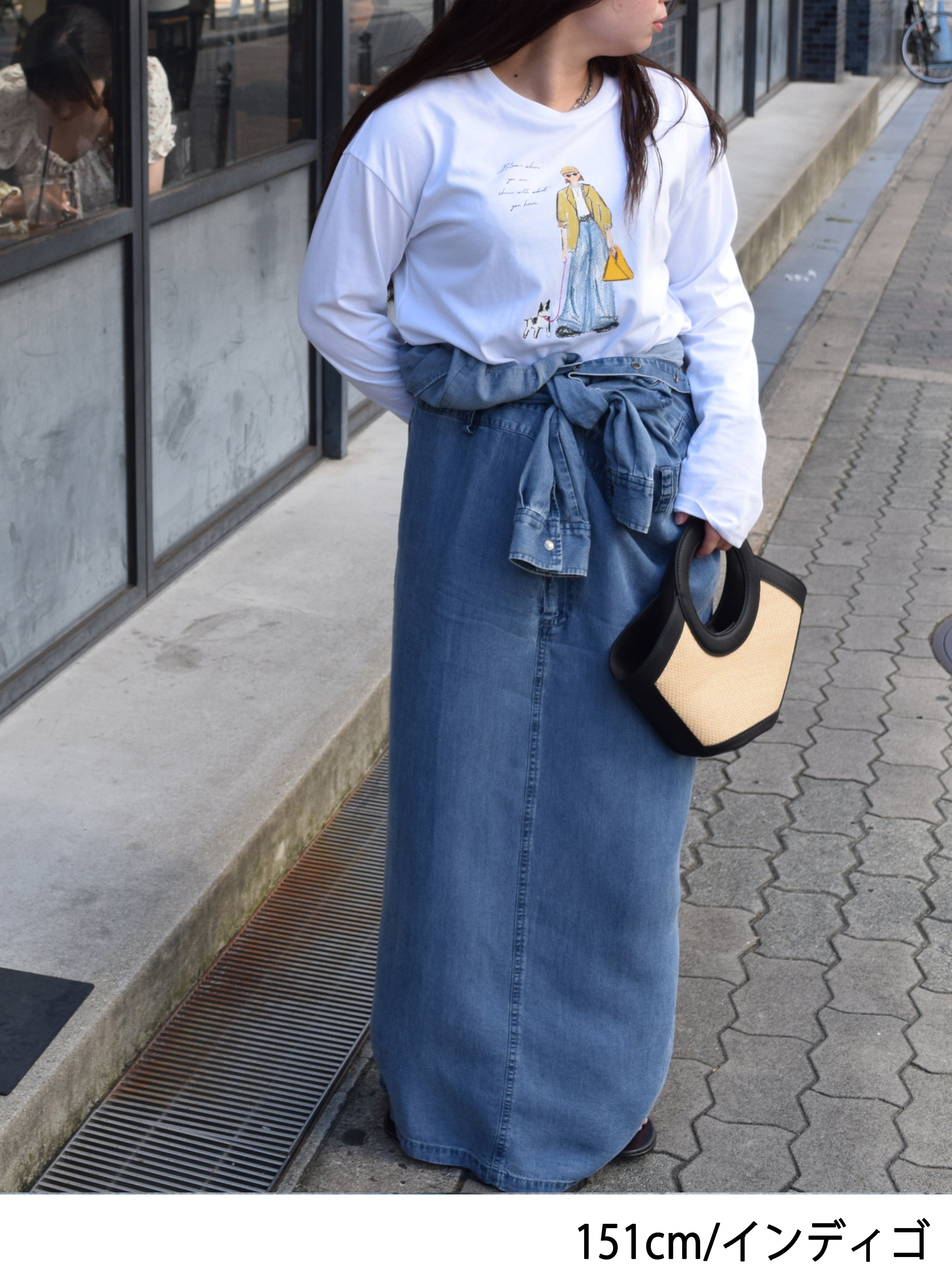 ウエスト位置で袖を結んでスカート風に着こなしのも旬スタイリングです。