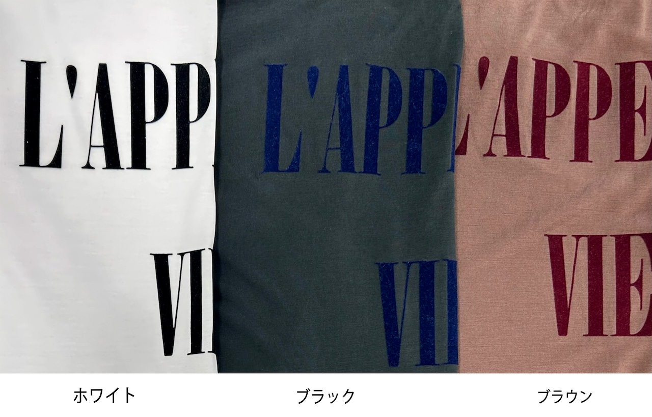 ロゴはフロッキー素材になっており、ホワイトには黒でメリハリを、ブラックとブラウンには微配色でさりげないデザインになっています。