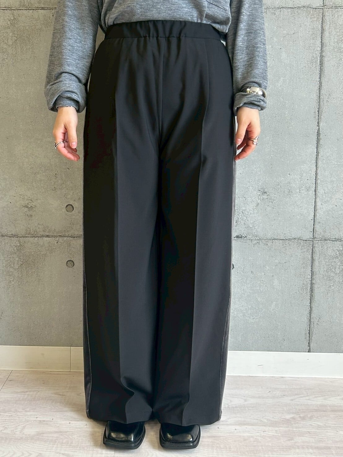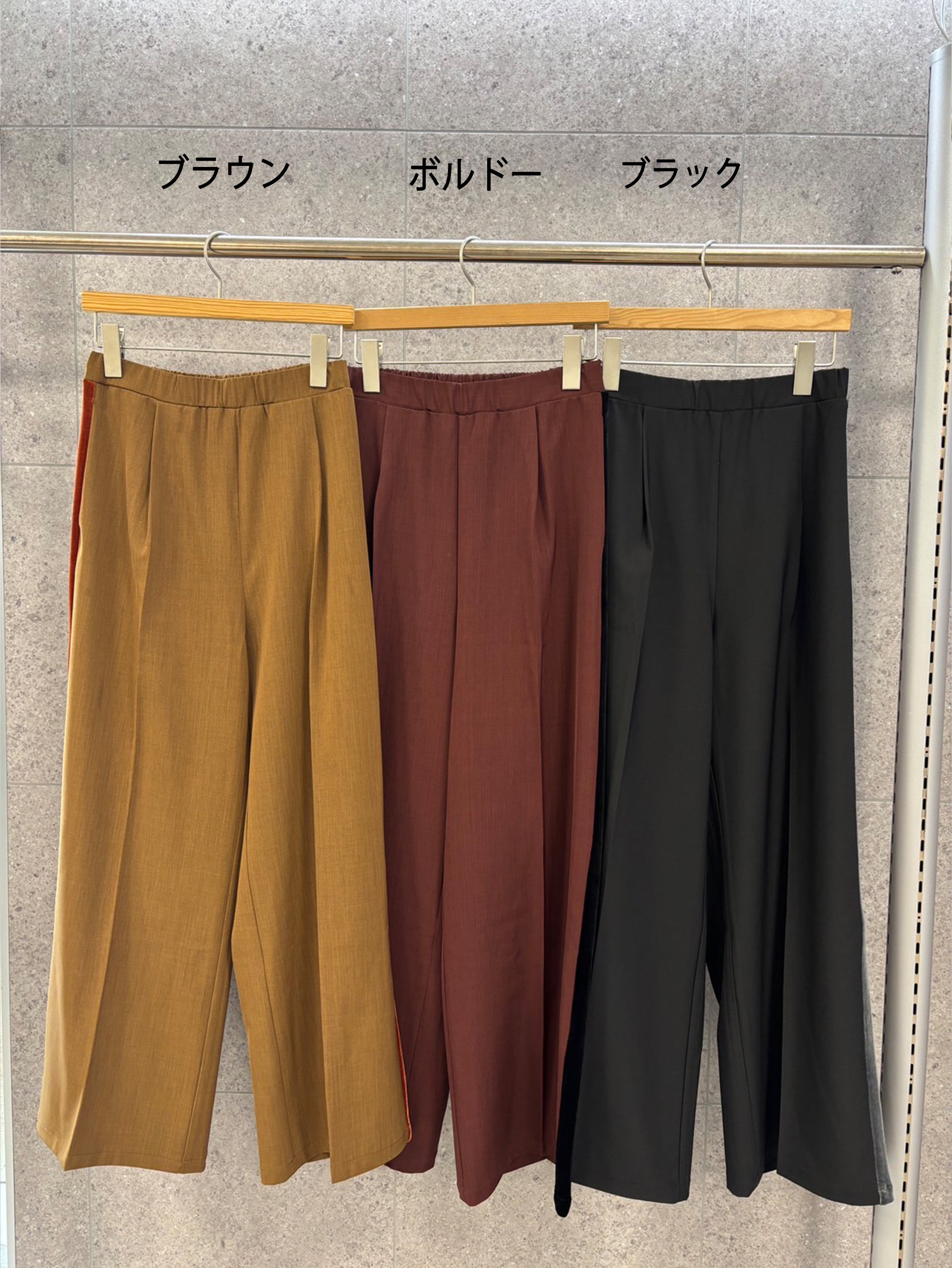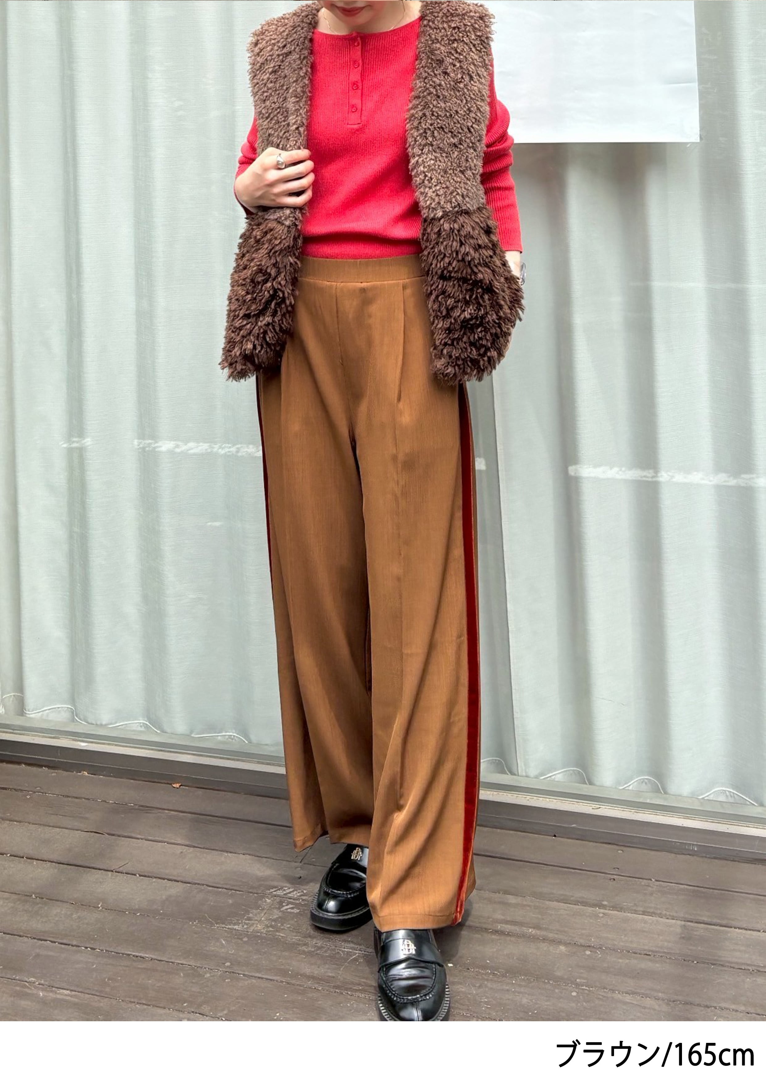 シンプルなスタイリングに品よく映えるベロアラインパンツ。
