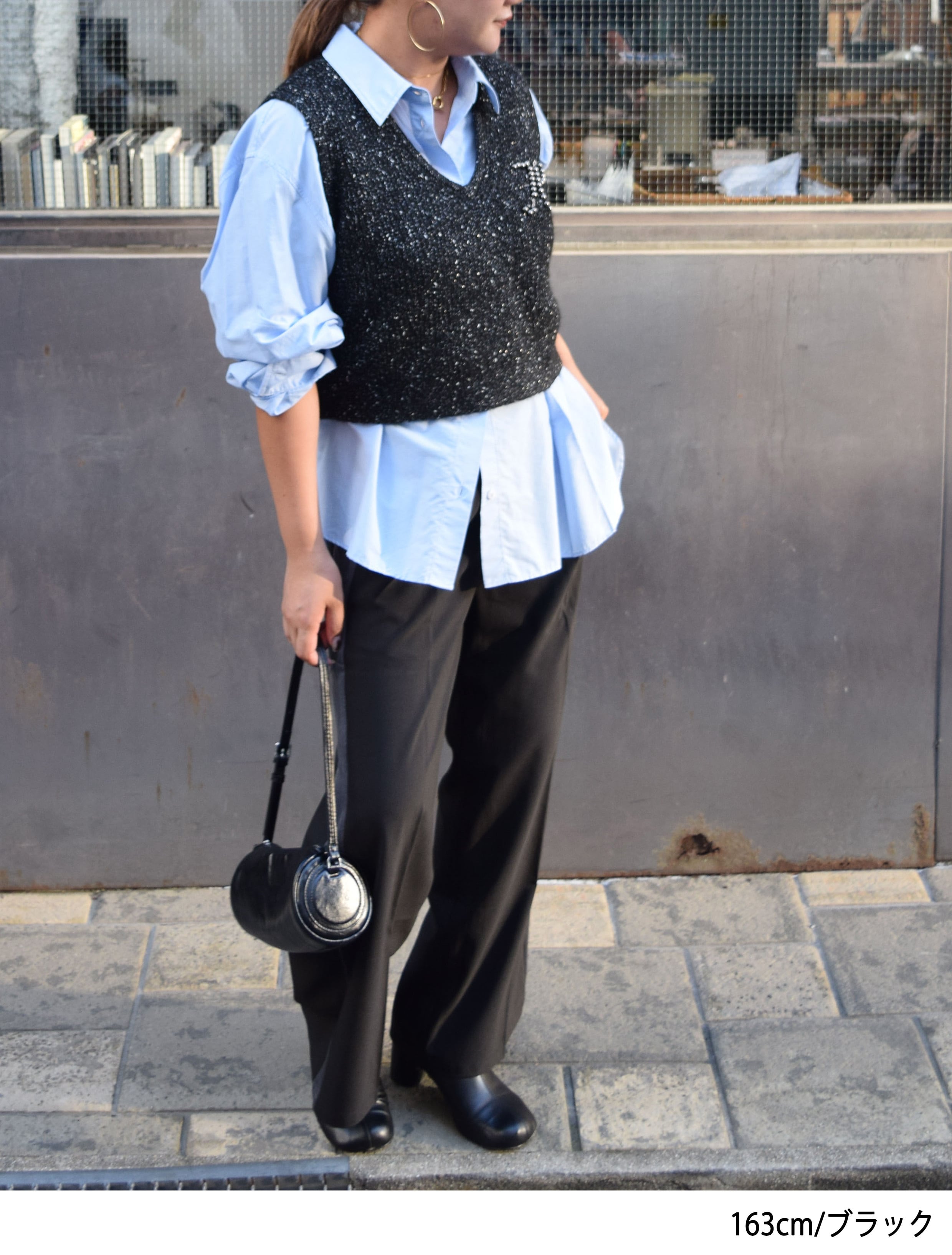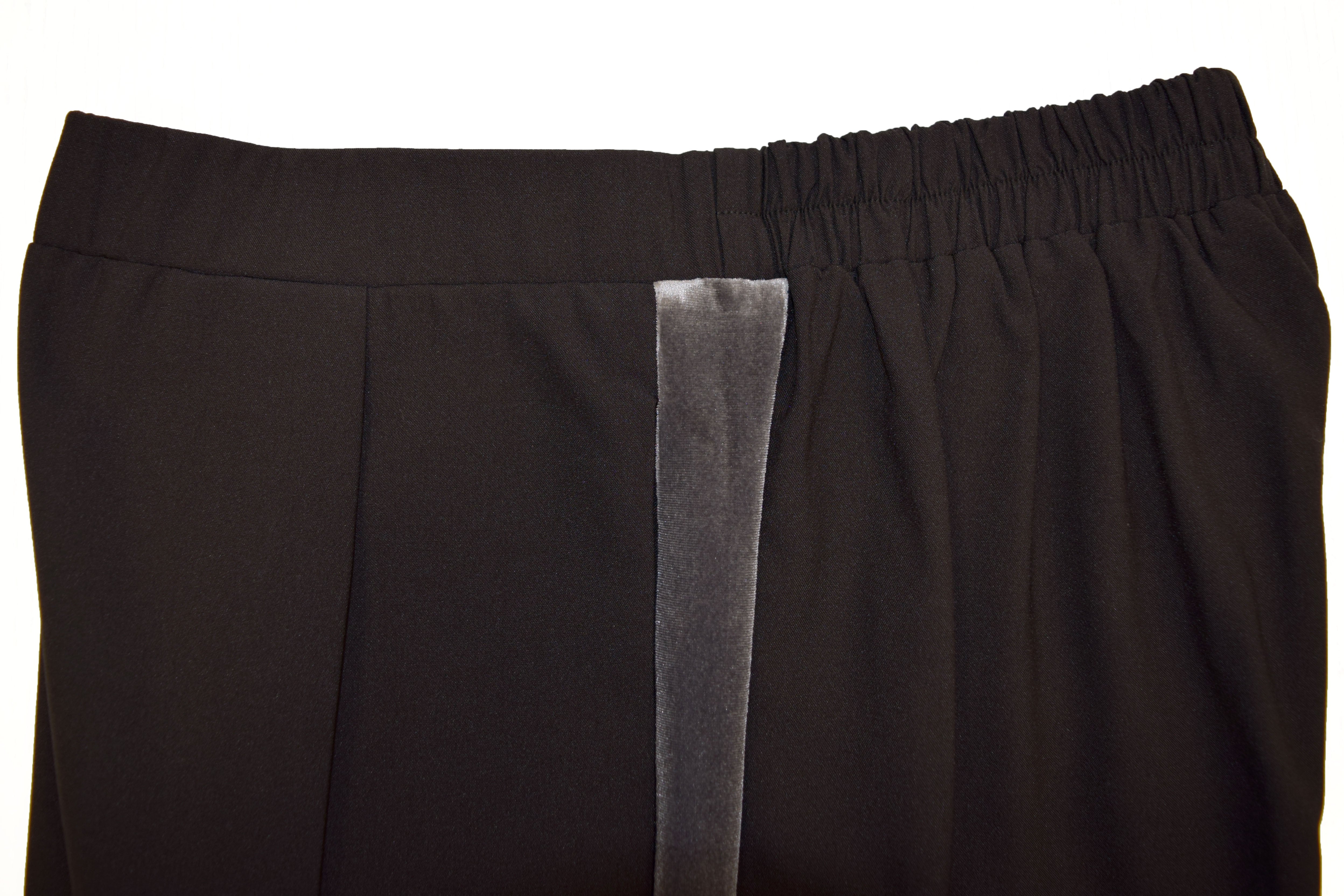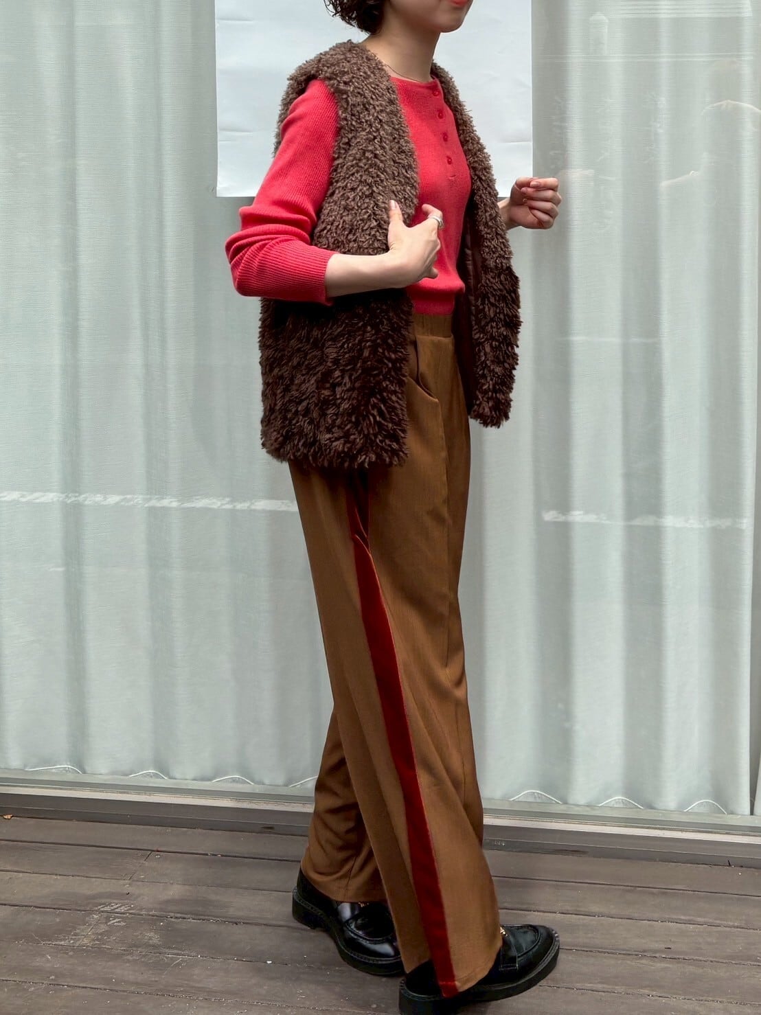 シンプルなスタイリングに品よく映えるベロアラインパンツ。
