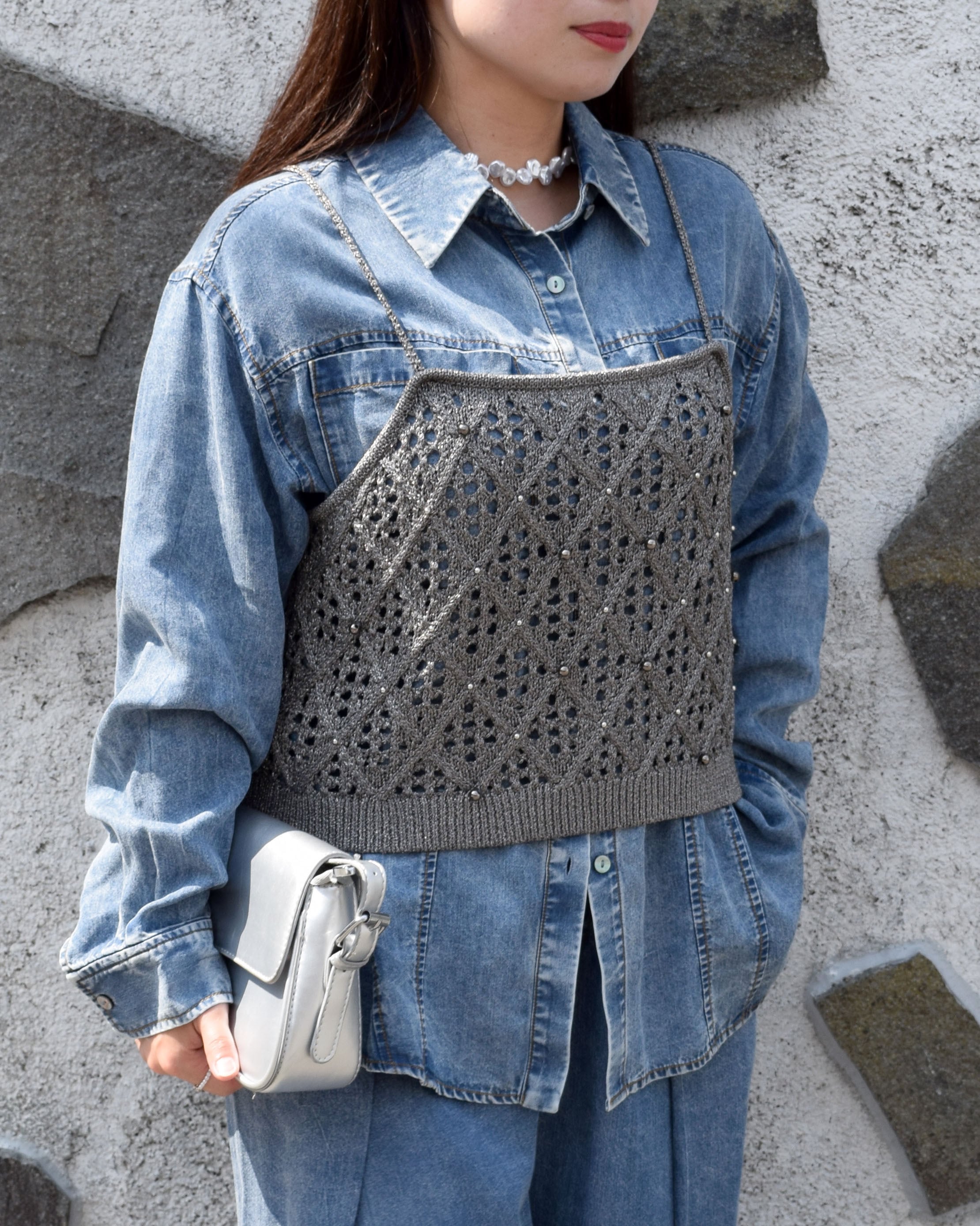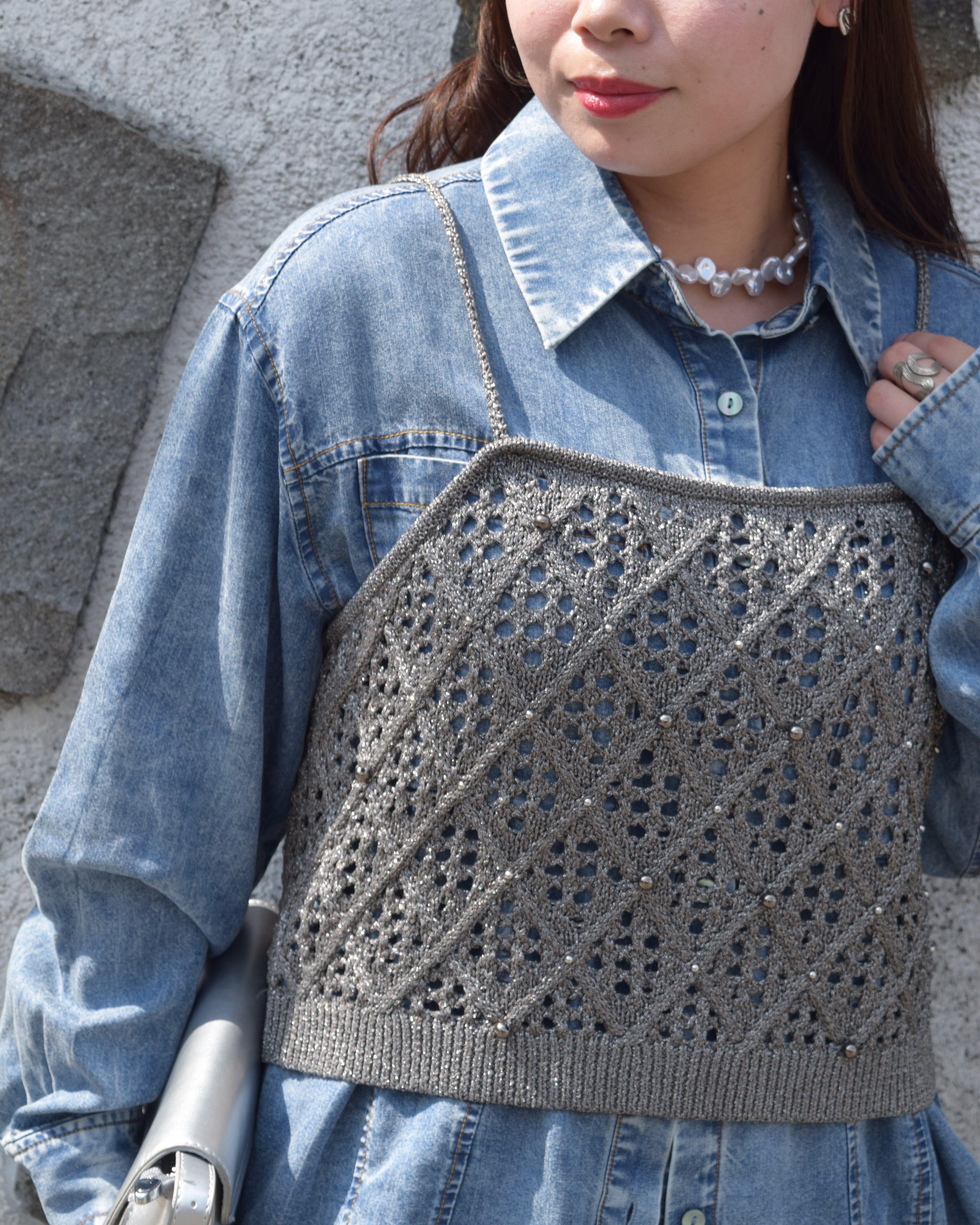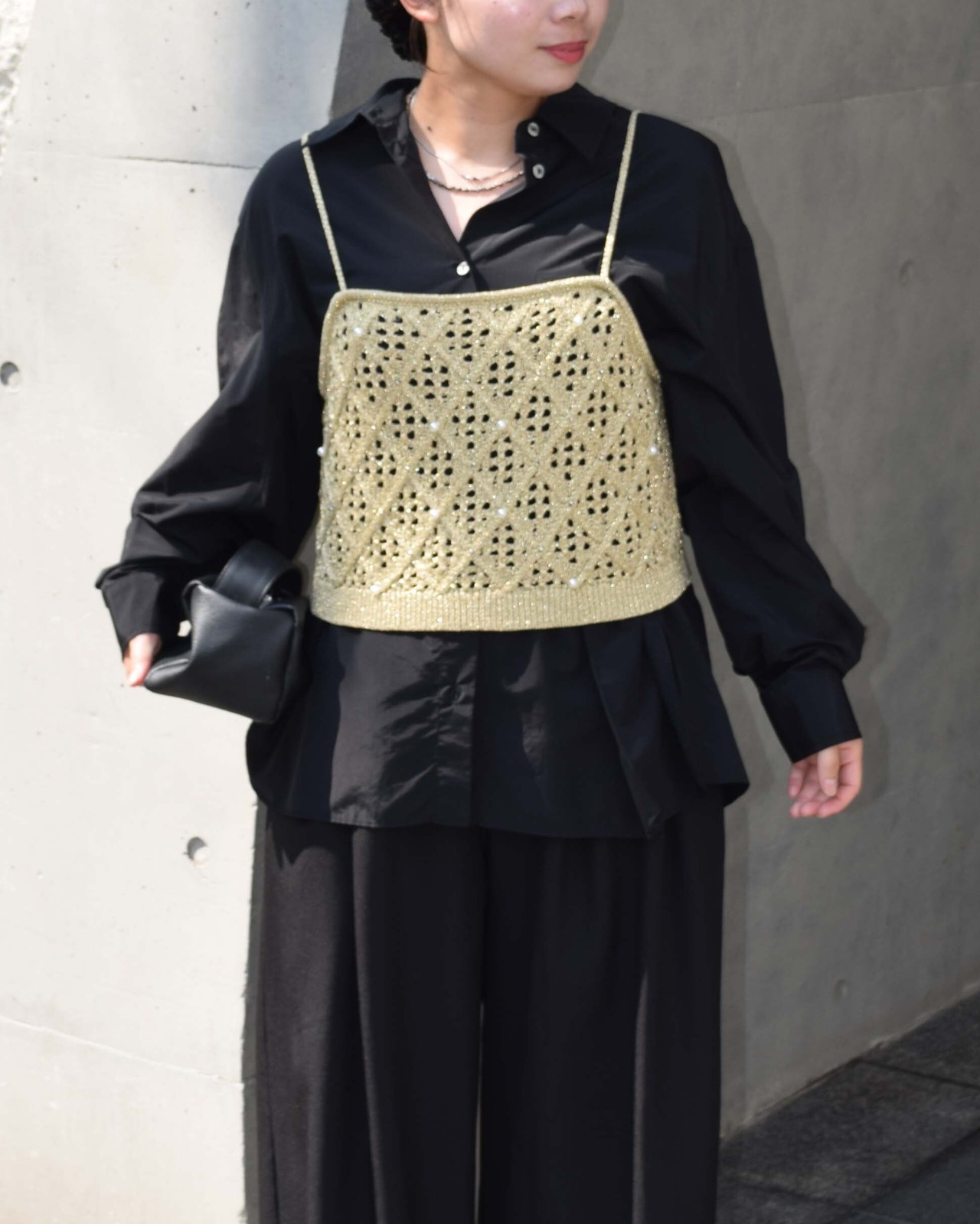 季節の変わり目にレイヤードを楽しめるニットビスチェ。