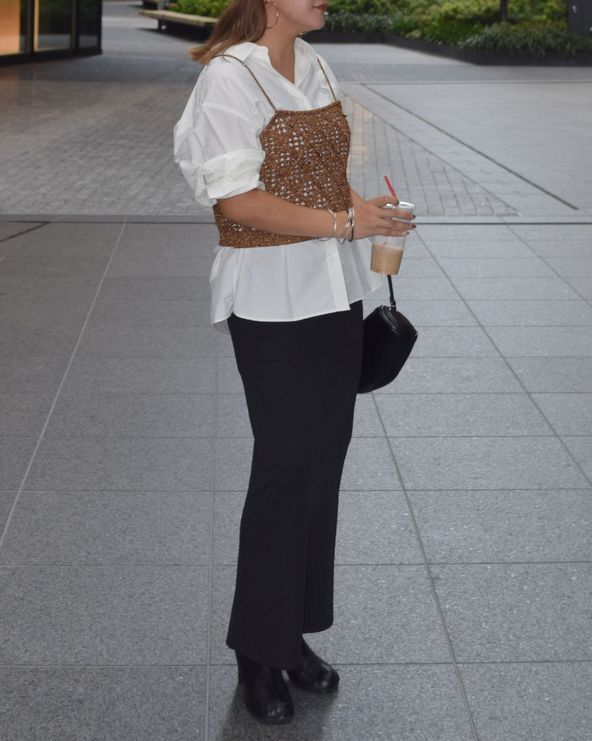 Tシャツやシャツとのレイヤードや、同素材のリブカーディガンとセットアップで着こなすのもおすすめです。