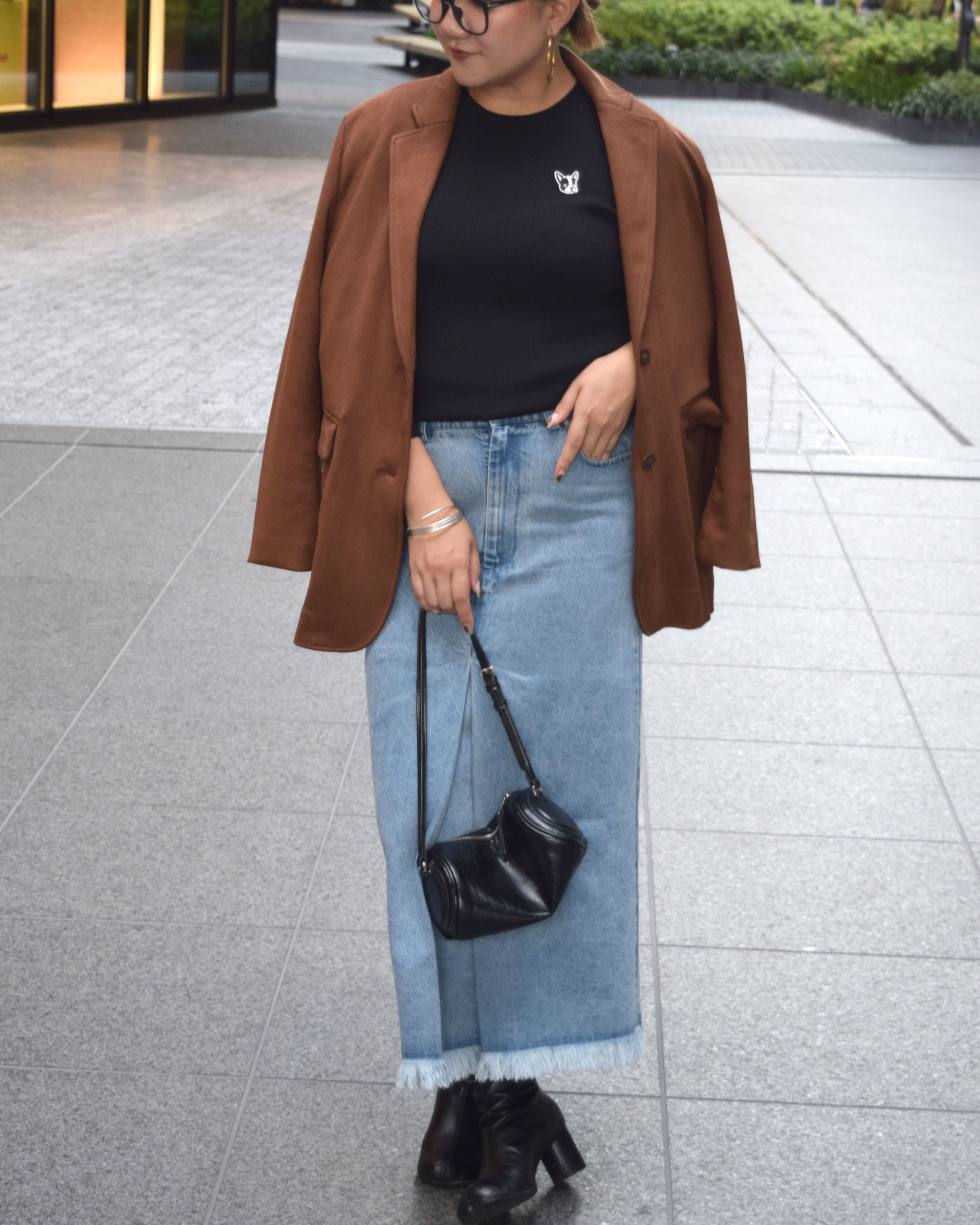 スッキリとしたシルエットなのでデニムやスッキリめのボトムスへインした着こなしも違和感なし◎