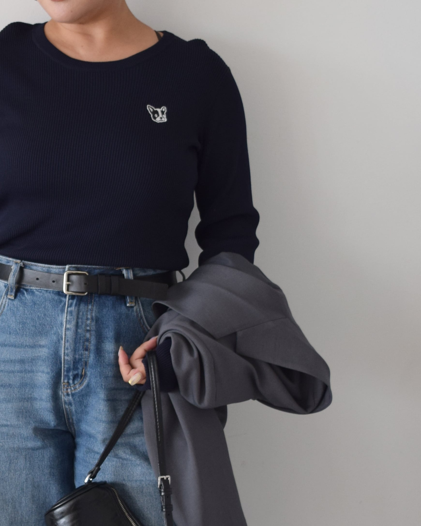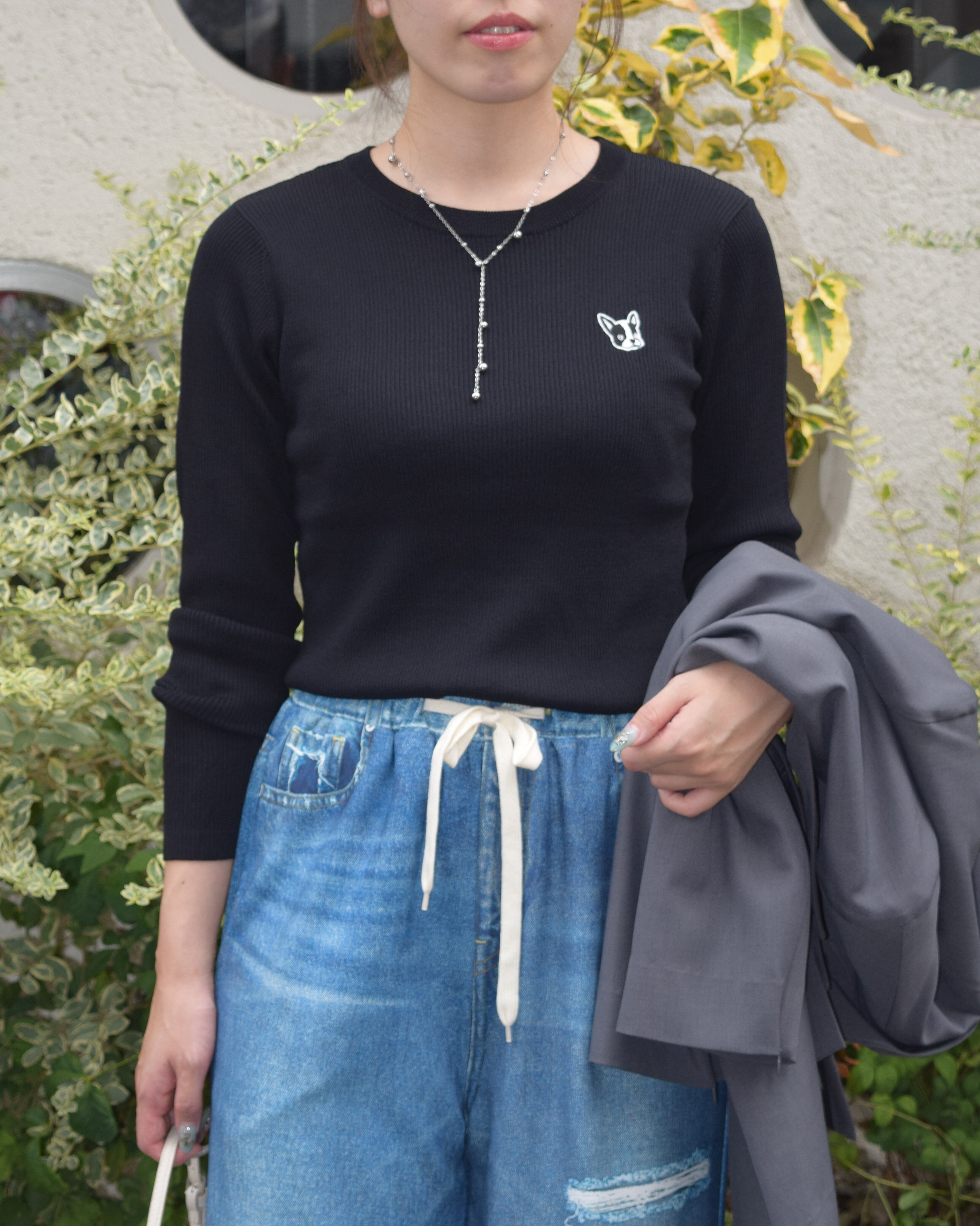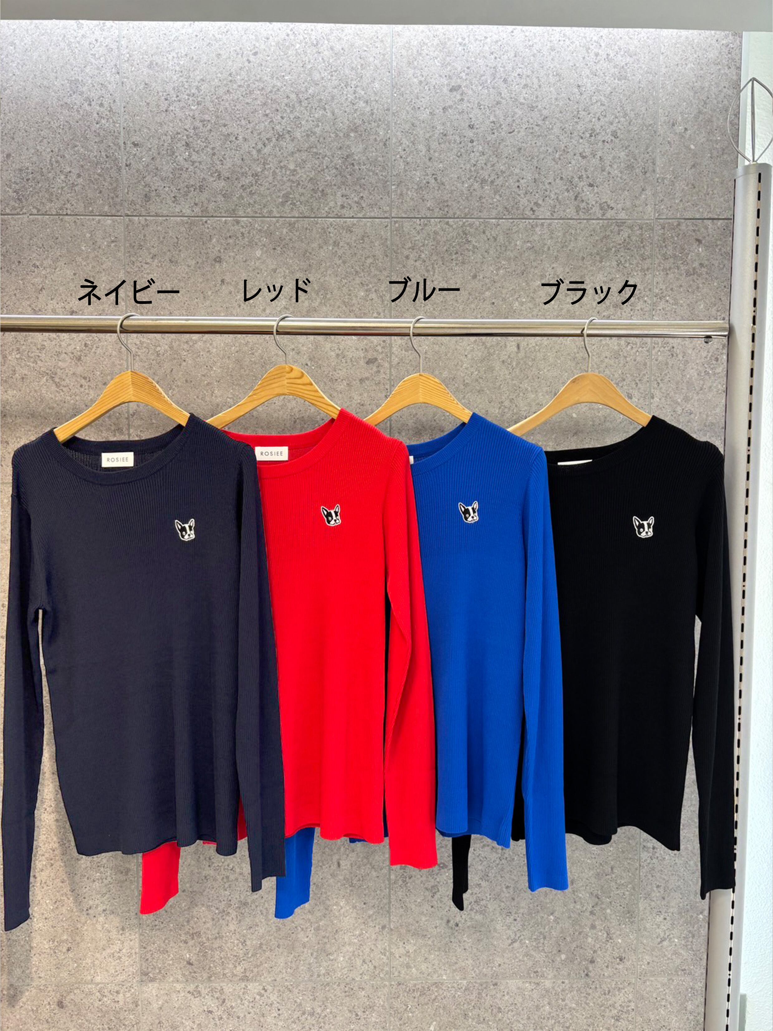 ROSIEEオリジナルのフレンチブルドックの刺繍がポイントになったリブニット。
