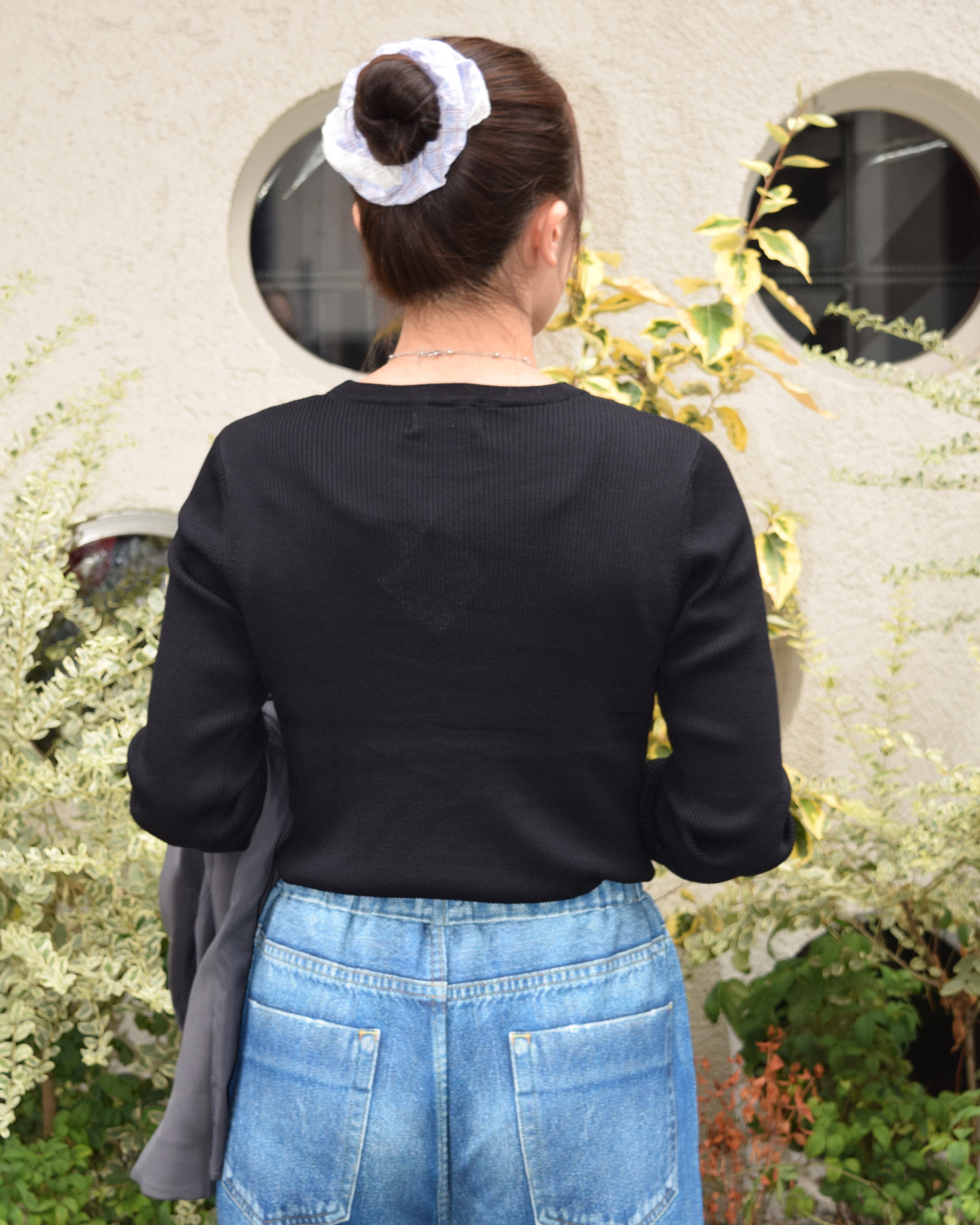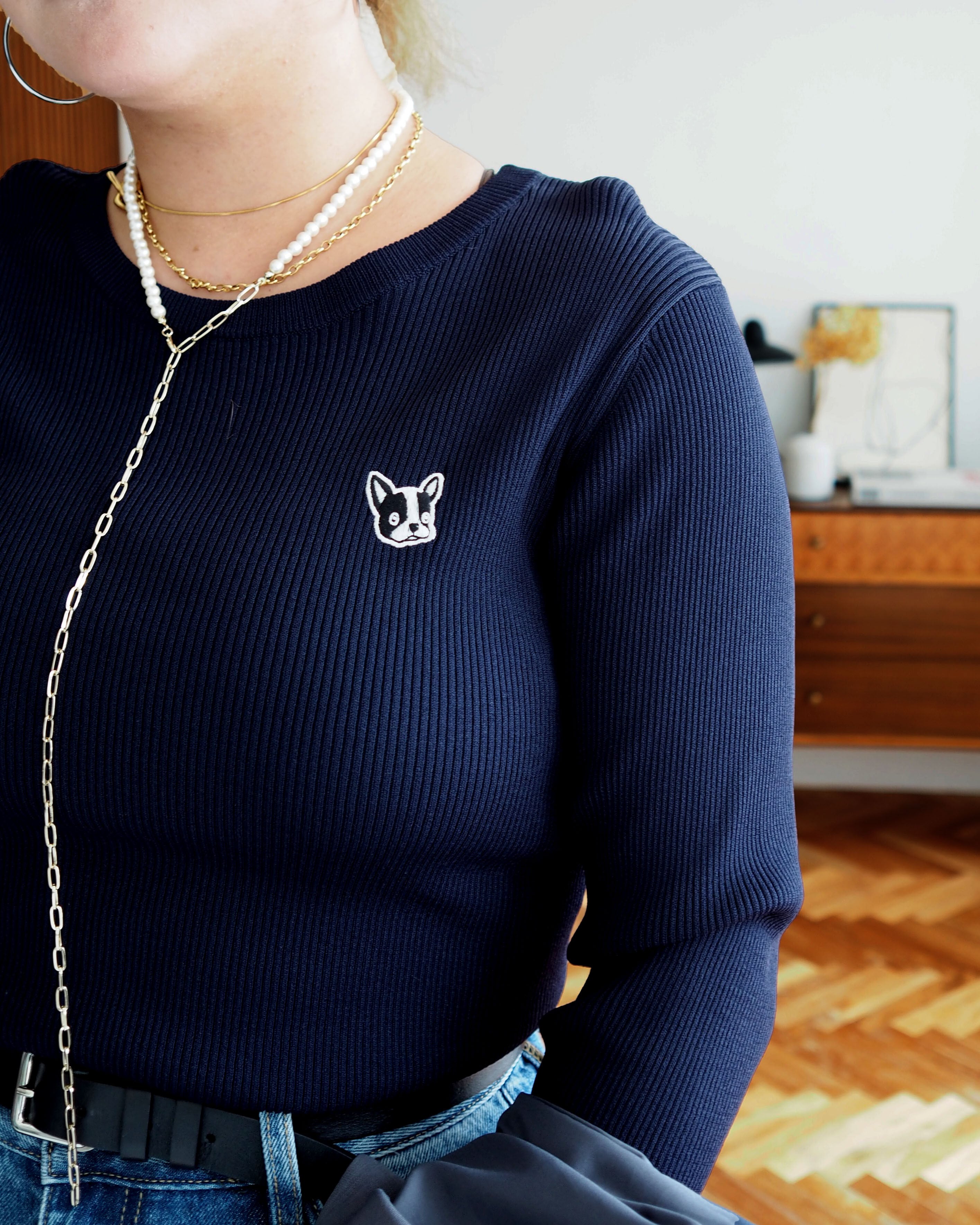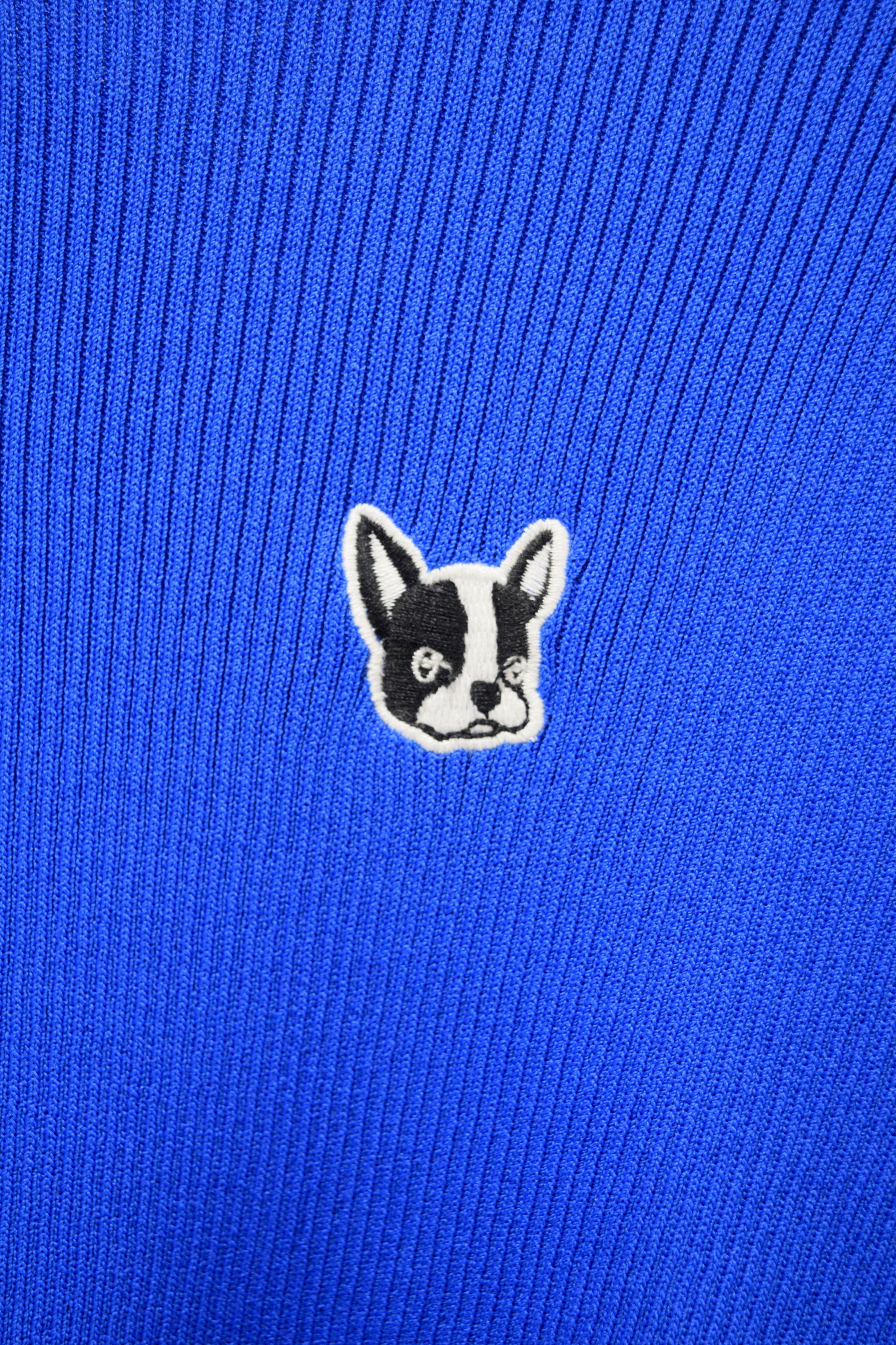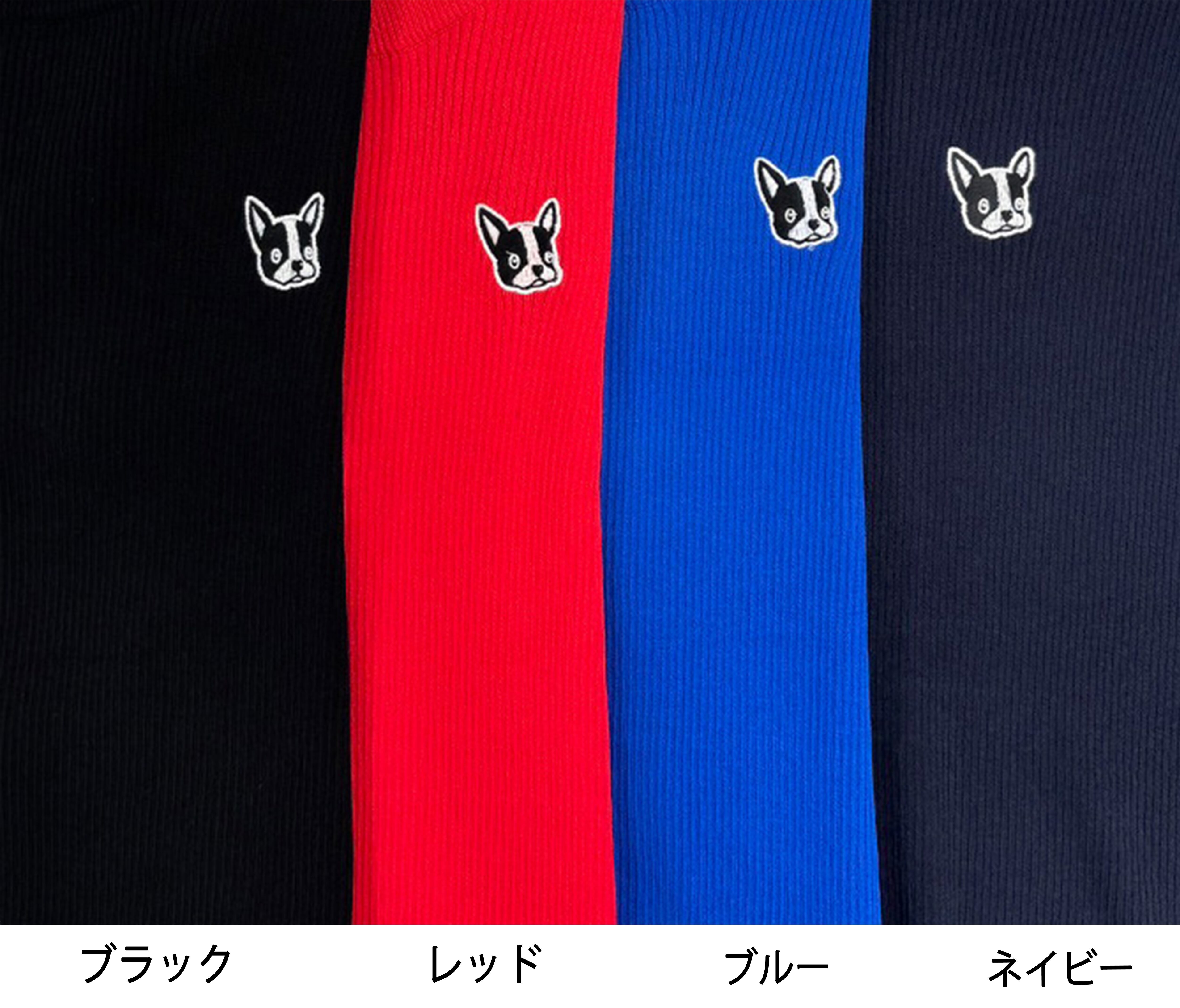 ROSIEEオリジナルのフレンチブルドックの刺繍がポイントになったリブニット。