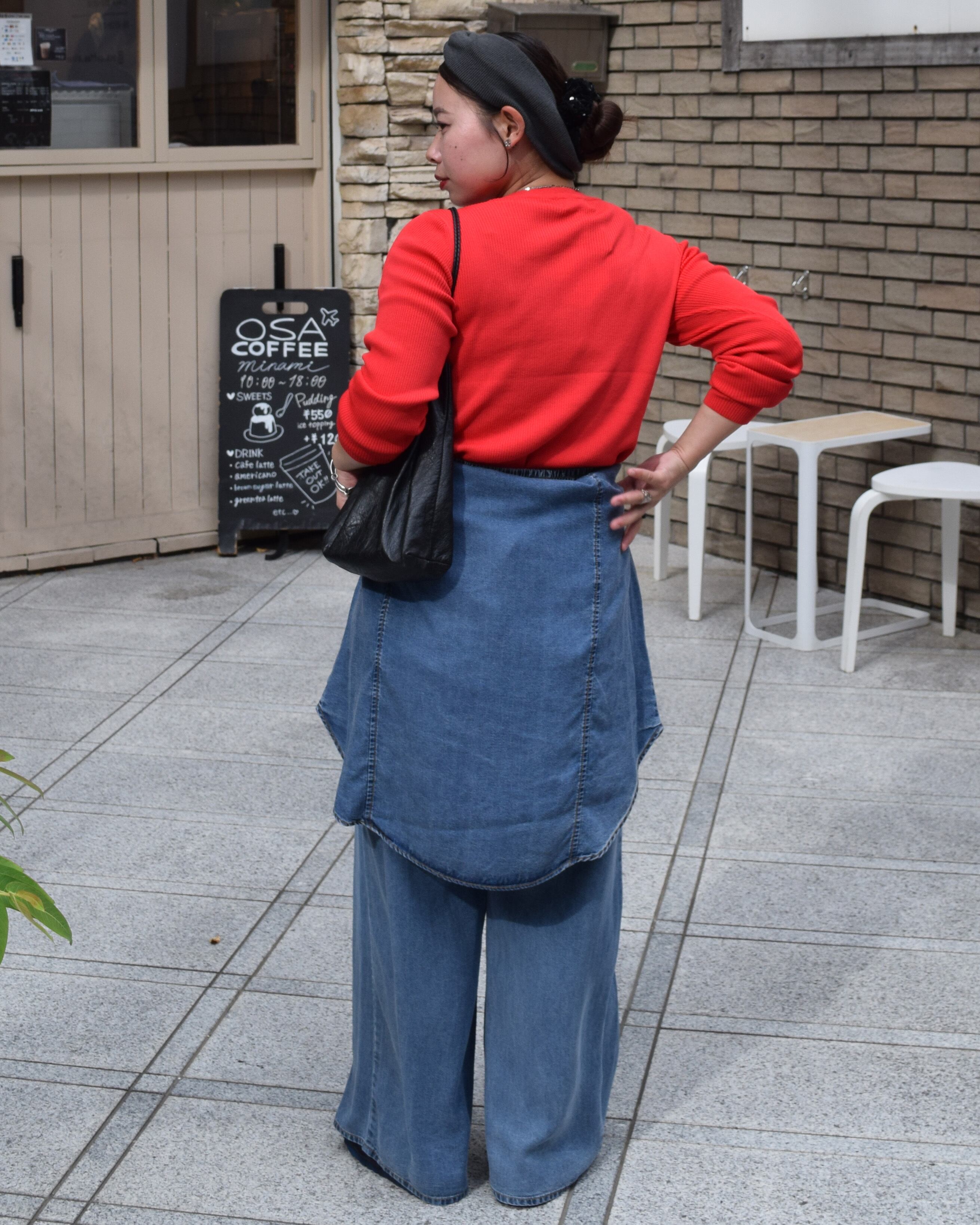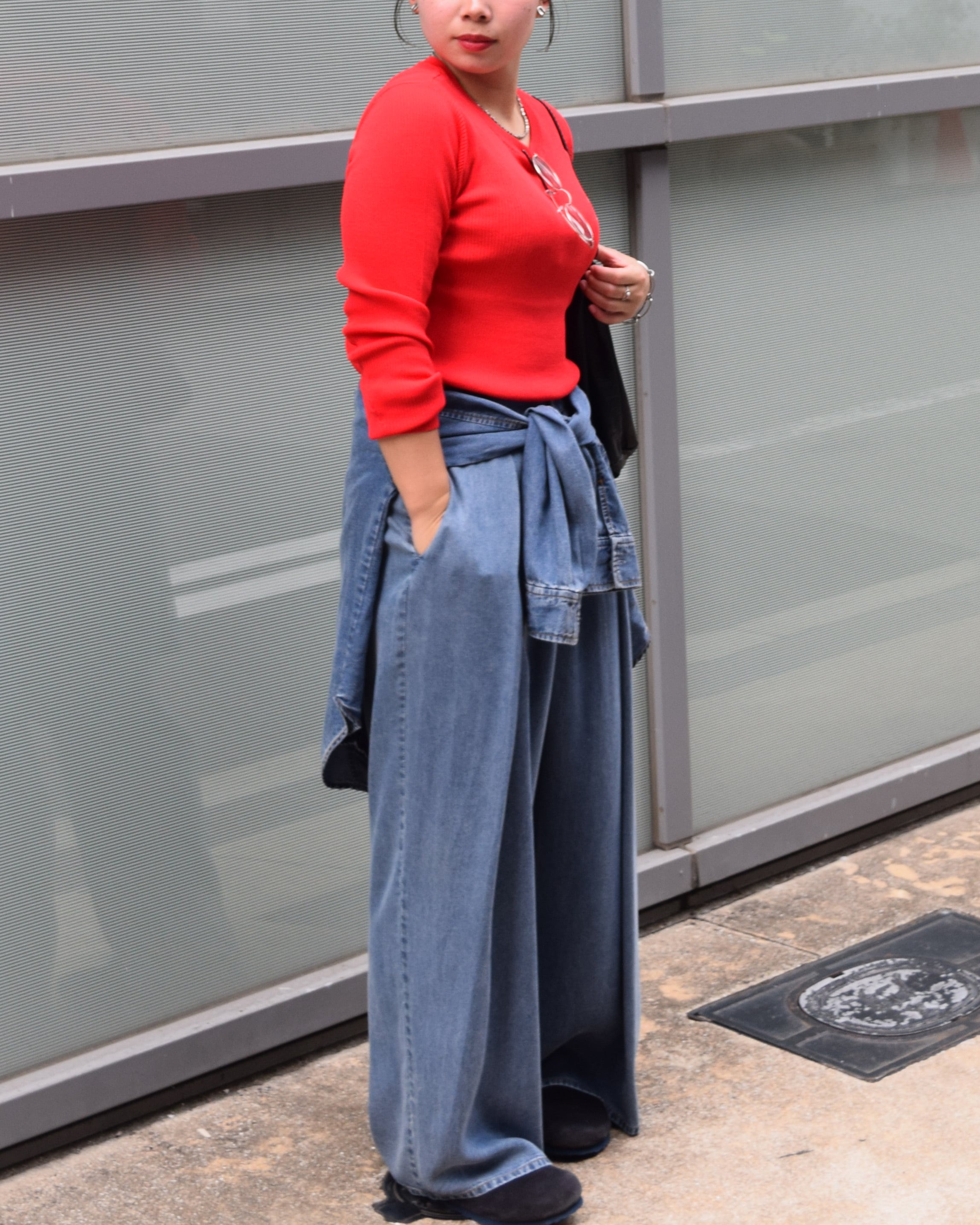 レッドにはブラウンや、ブルーにはデニムなどカラー同士の合わせもオススメです。