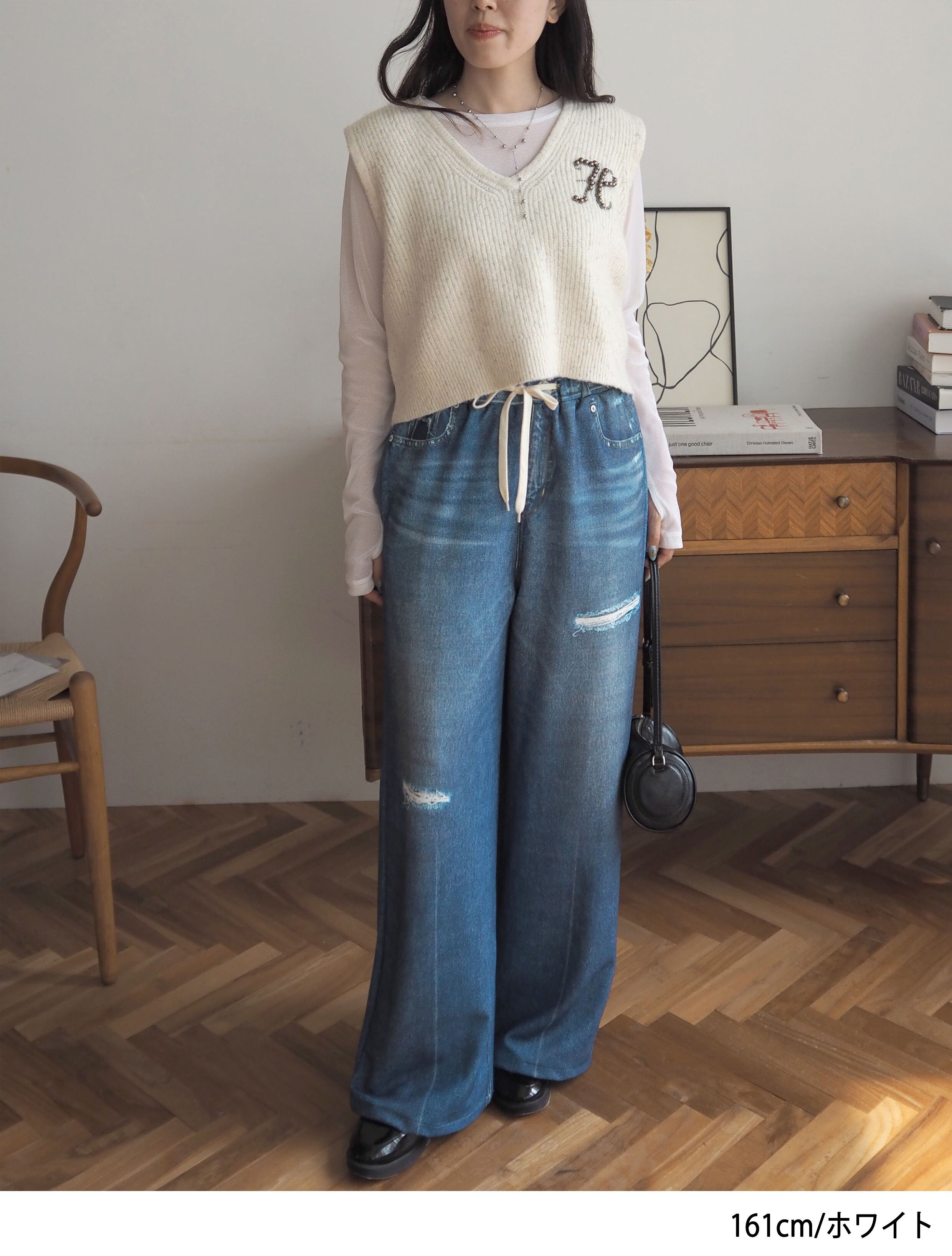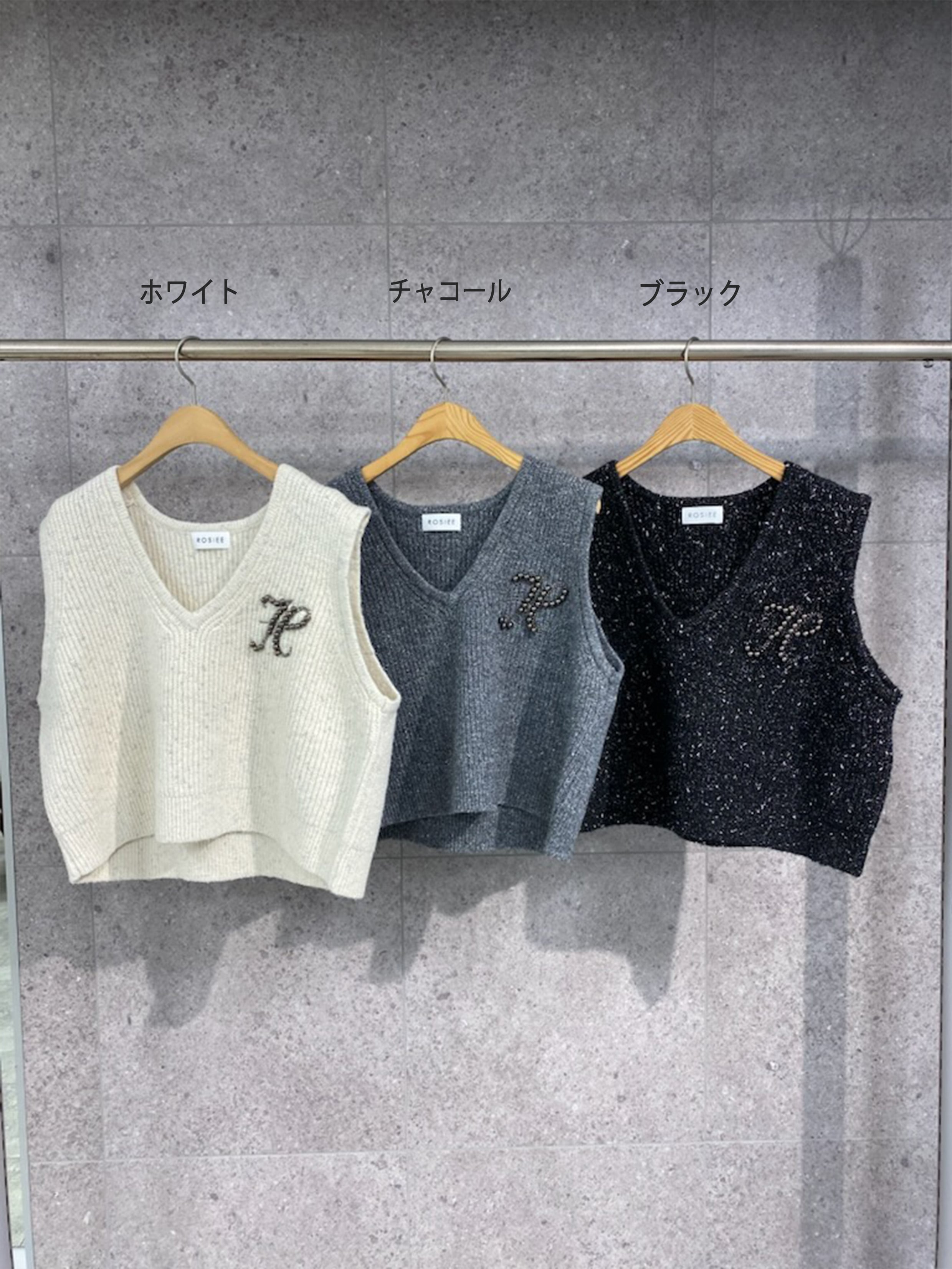 胸元のブローチ風イニシャルロゴがポイントになるベスト。