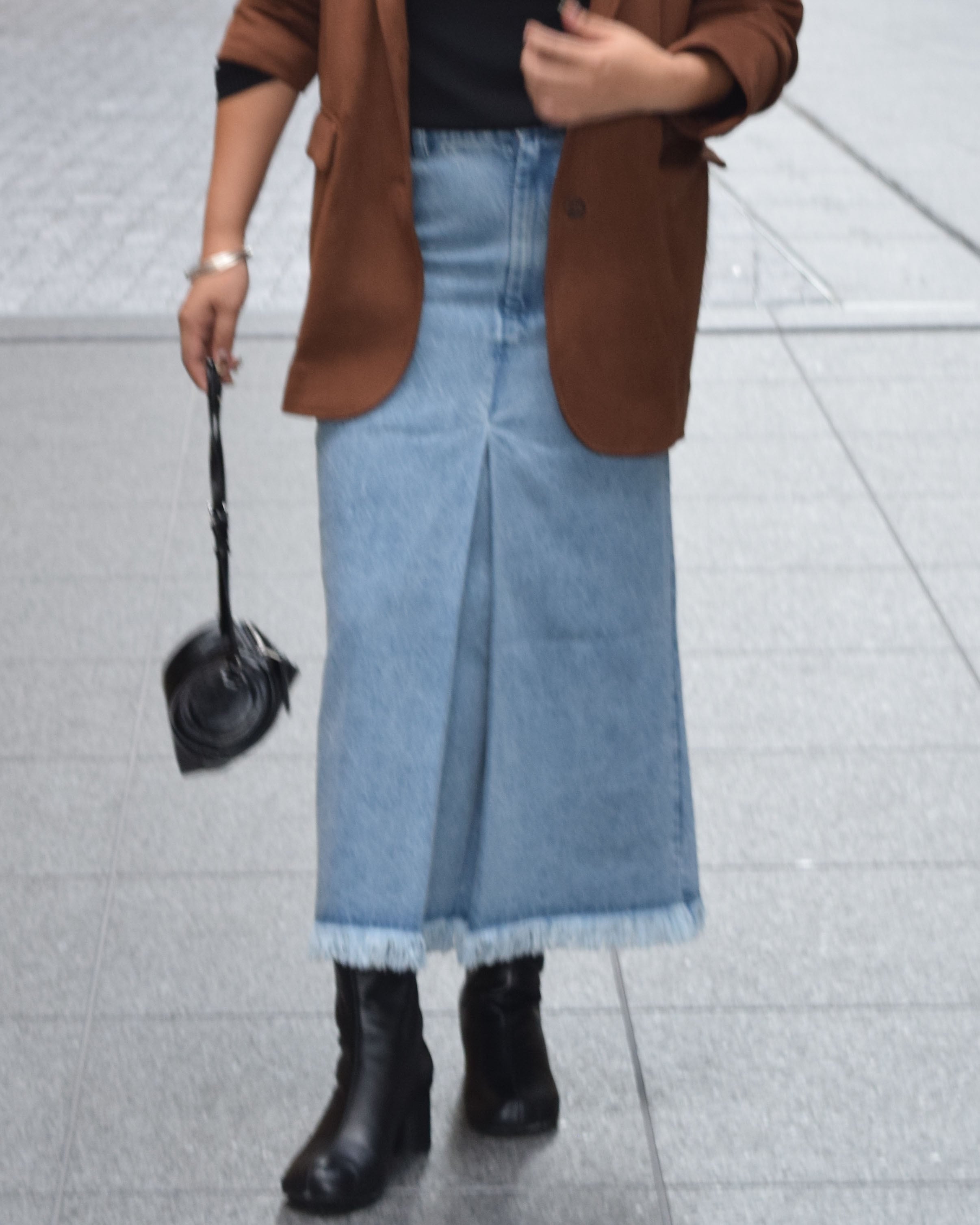 ロングブーツと合わせた秋冬らしいスタイリングがオススメ。