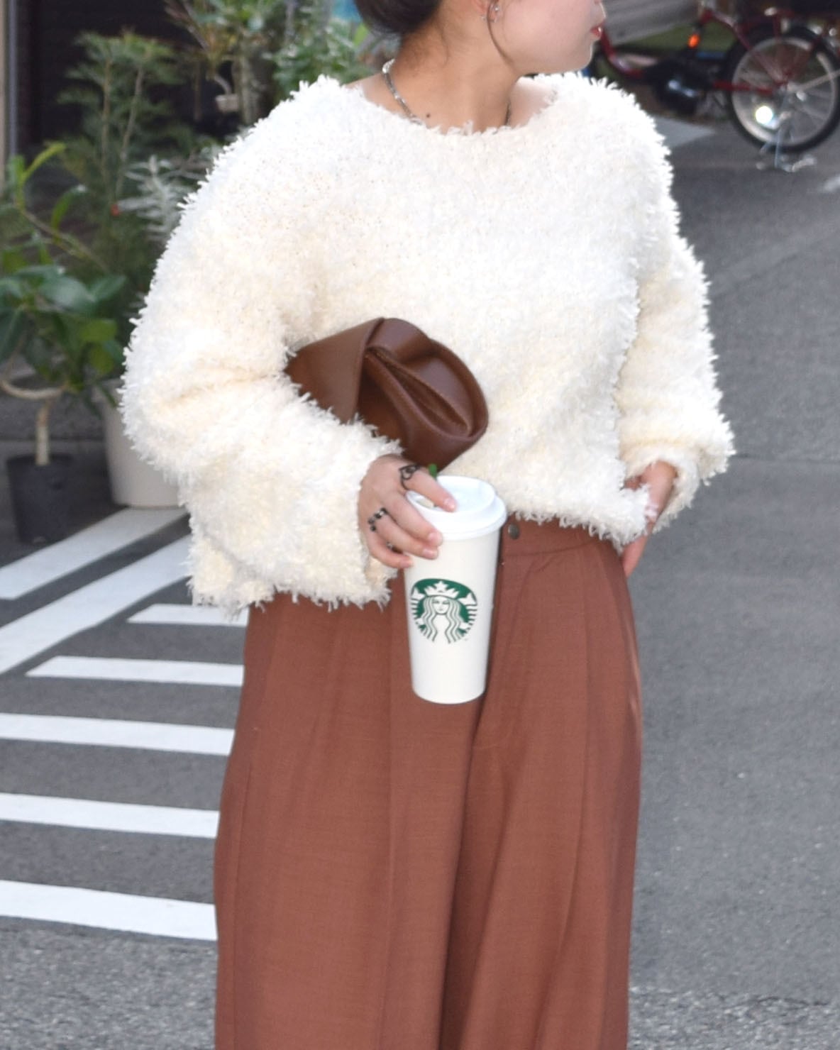 1枚でも存在感のあるニットなので、シンプルなスタイリングでもしっかり映えるアイテムです。