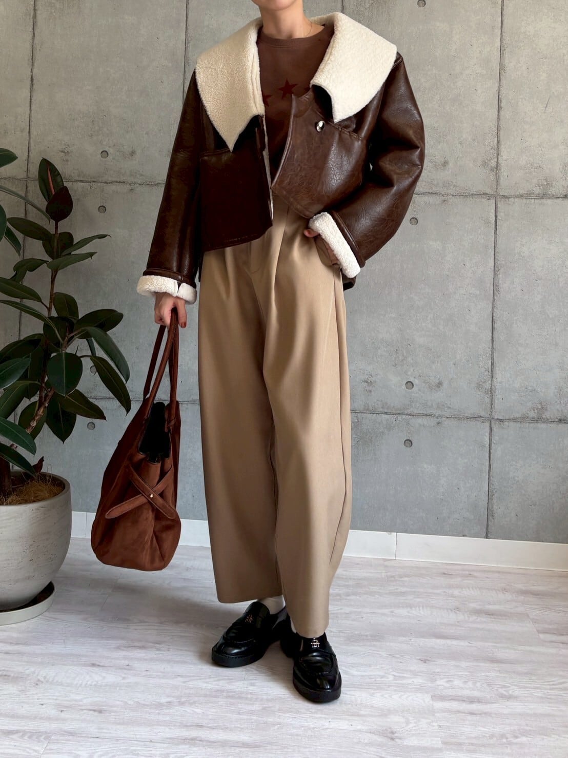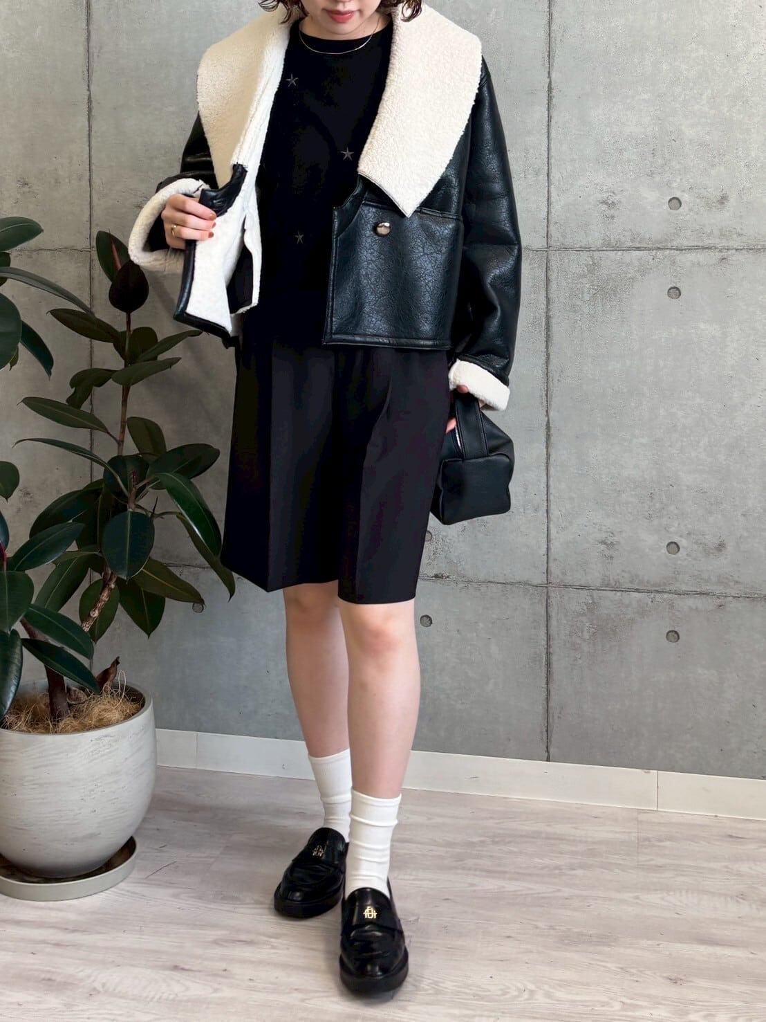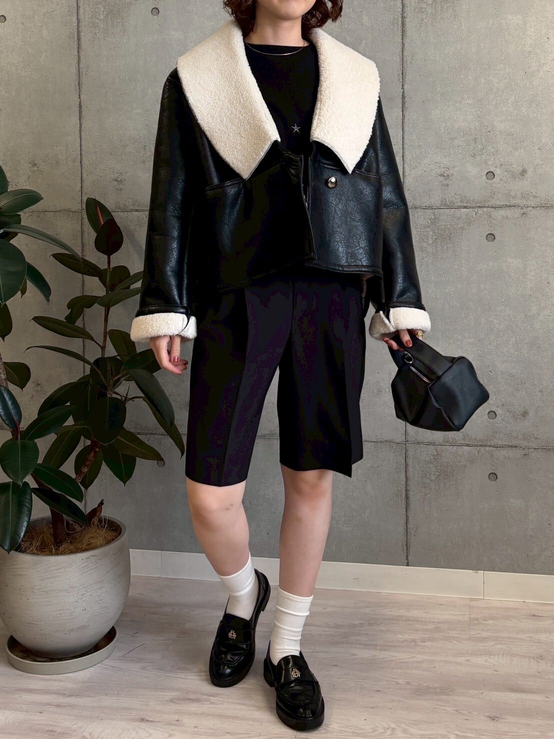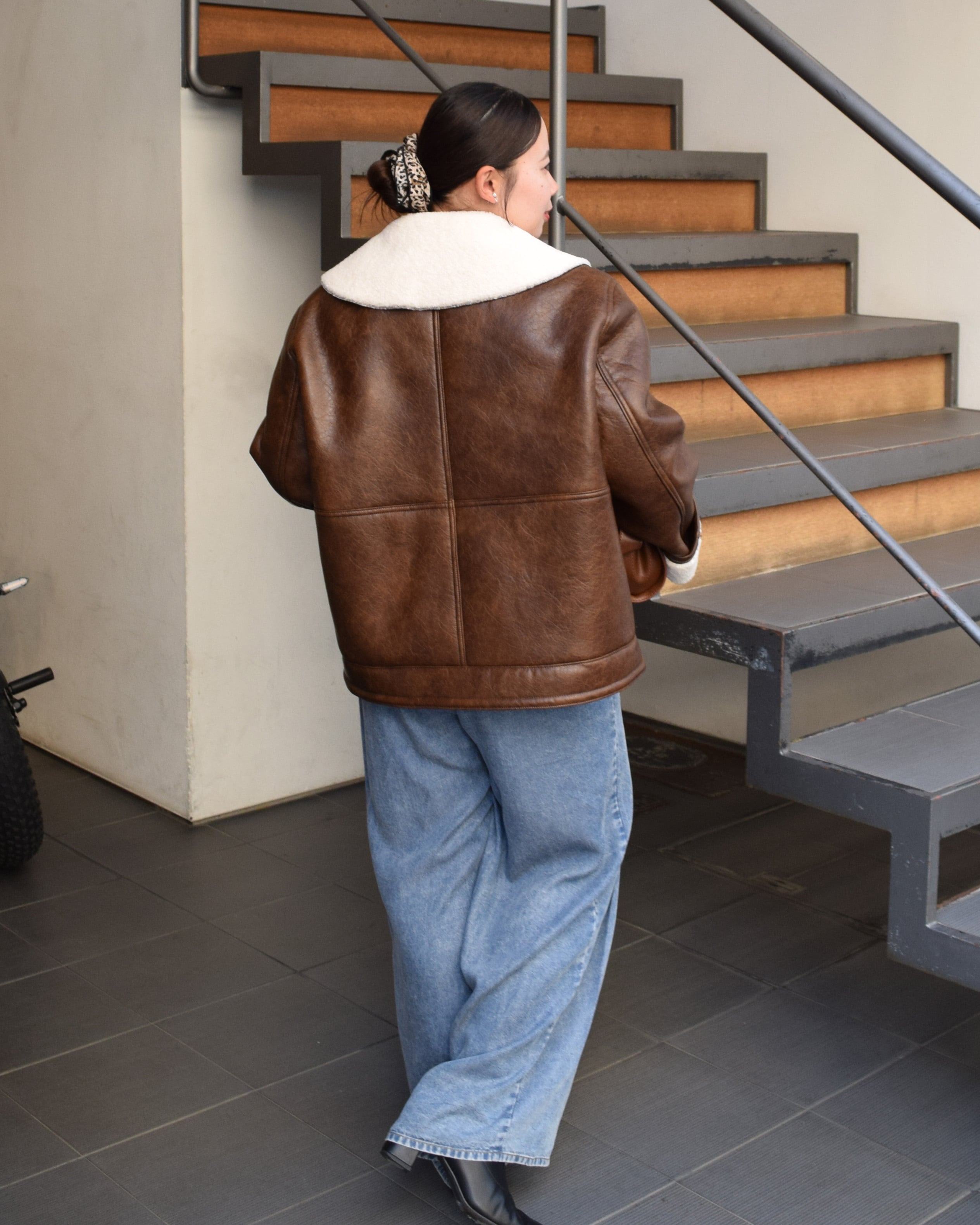 表地には上品なツヤのあるフェイクレザーを使用し、裏面にはふんわりとしたボア素材を施した暖かみのあるジャケット。程よいハリ感があり、立体的なシルエットをキープします。