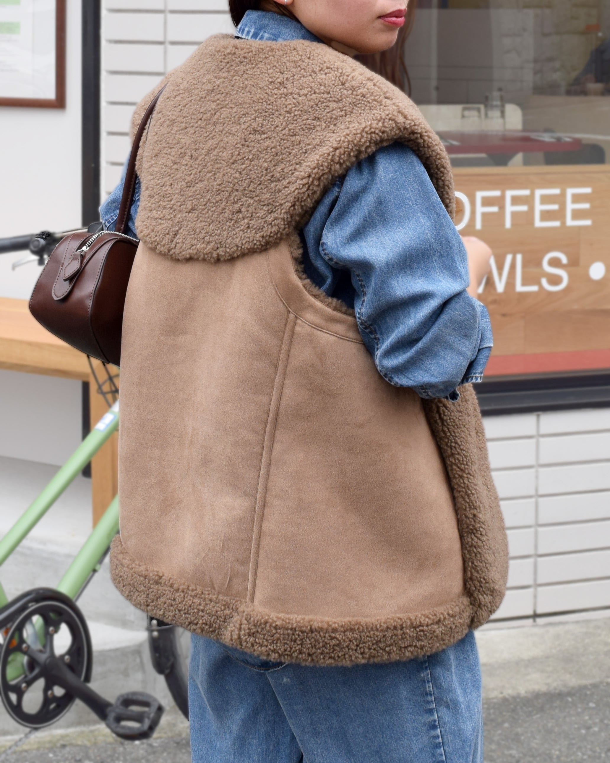 ふっくらとしたフェイクムートン素材を使用したショール風の2wayベスト。