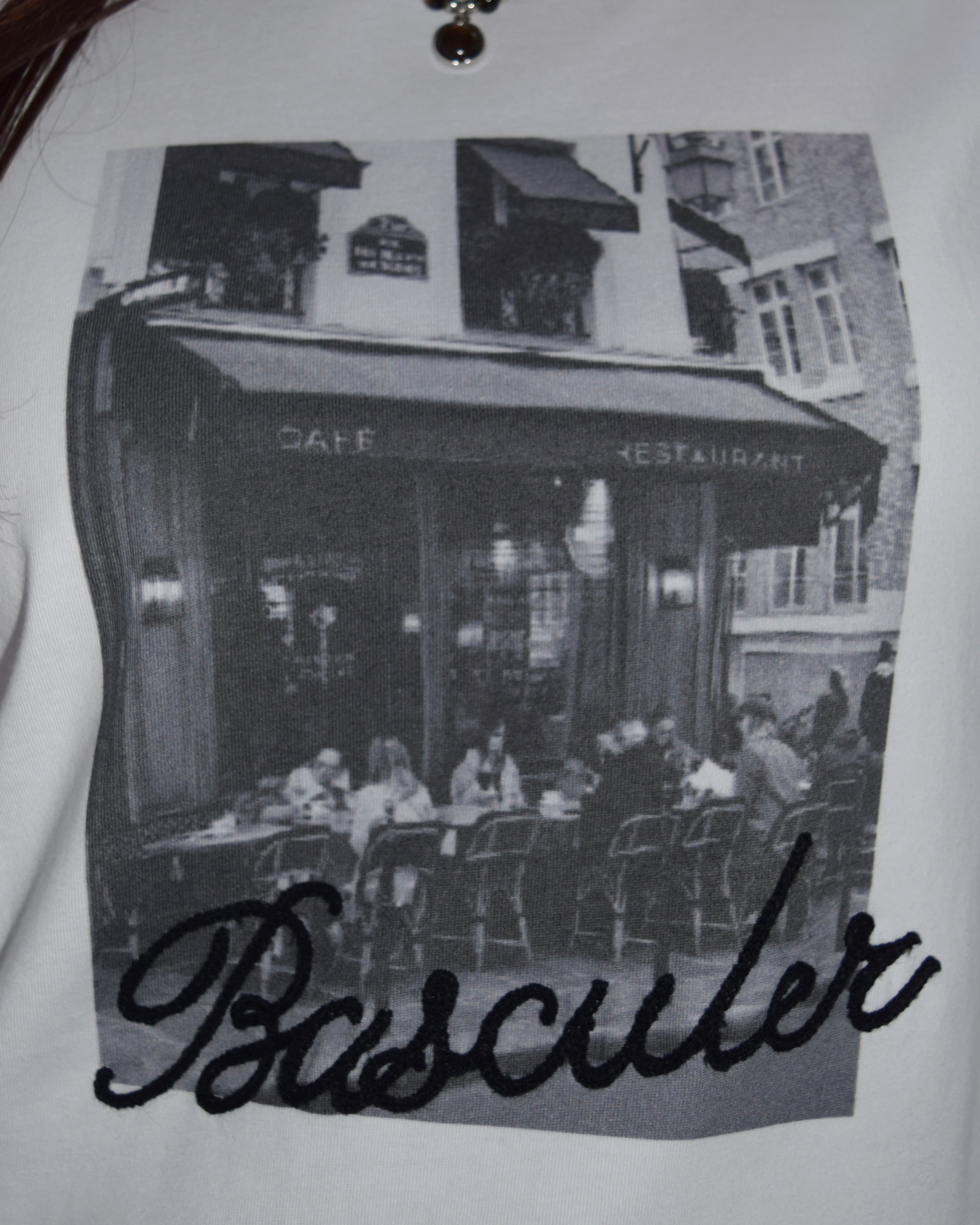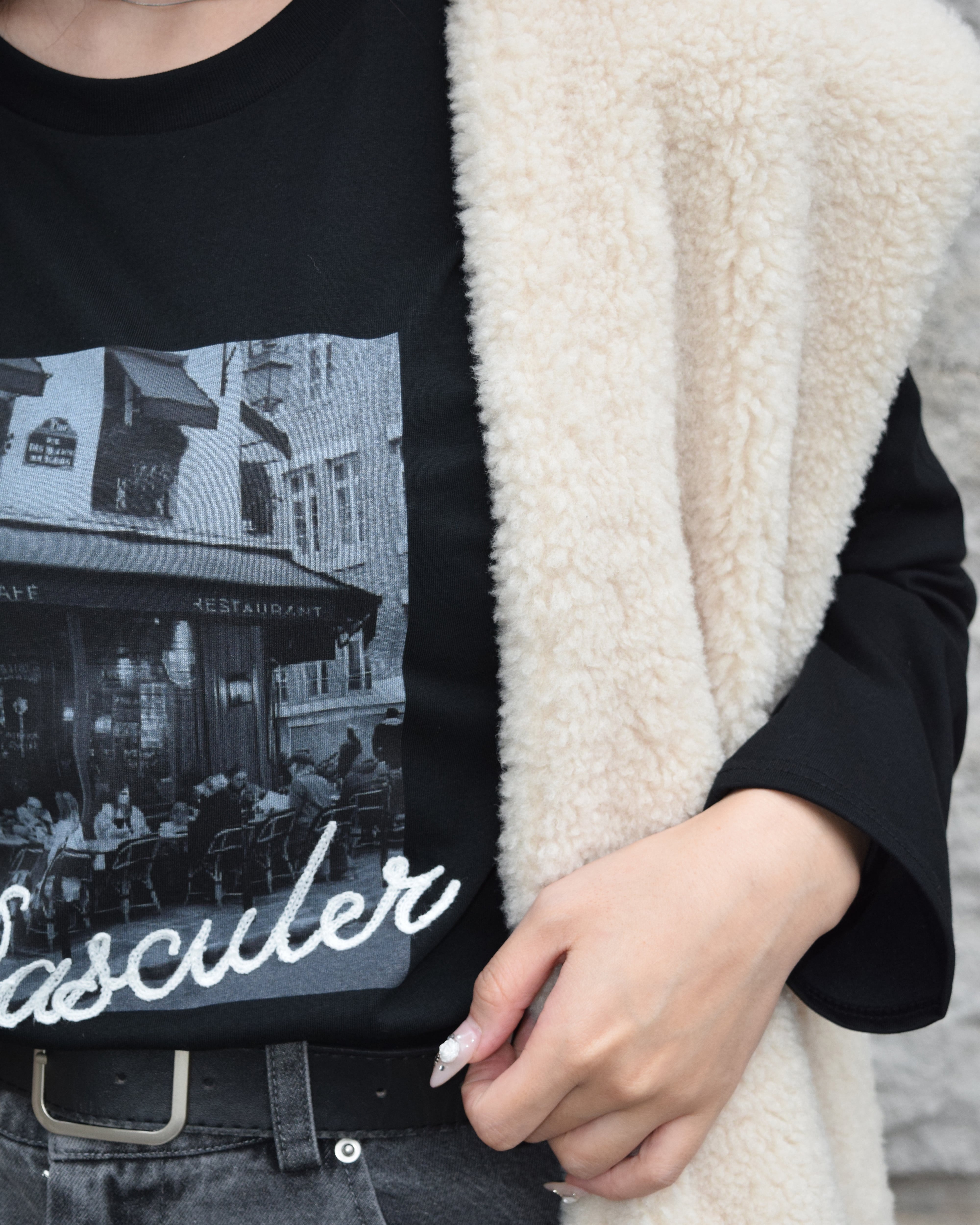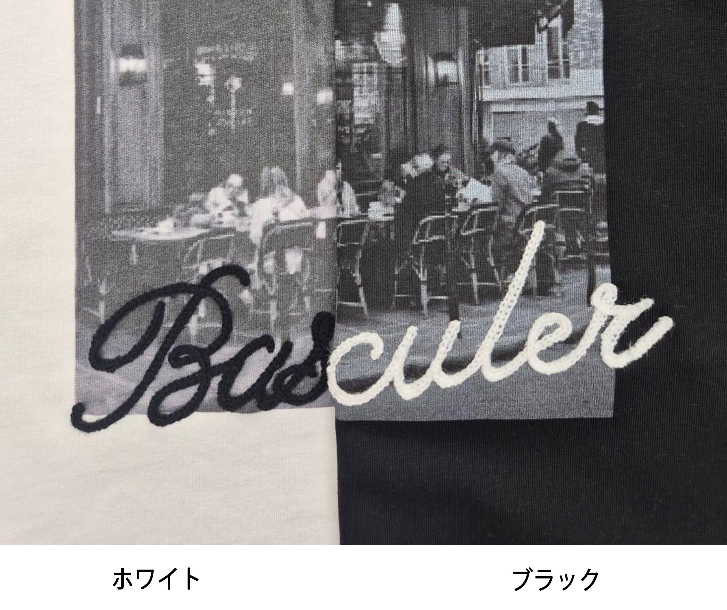 フロントには、"Bascule”のロゴとパリのカフェを切り取ったようなフォトプリントを組み合わせ、モードでかっこいい印象に仕上げました。