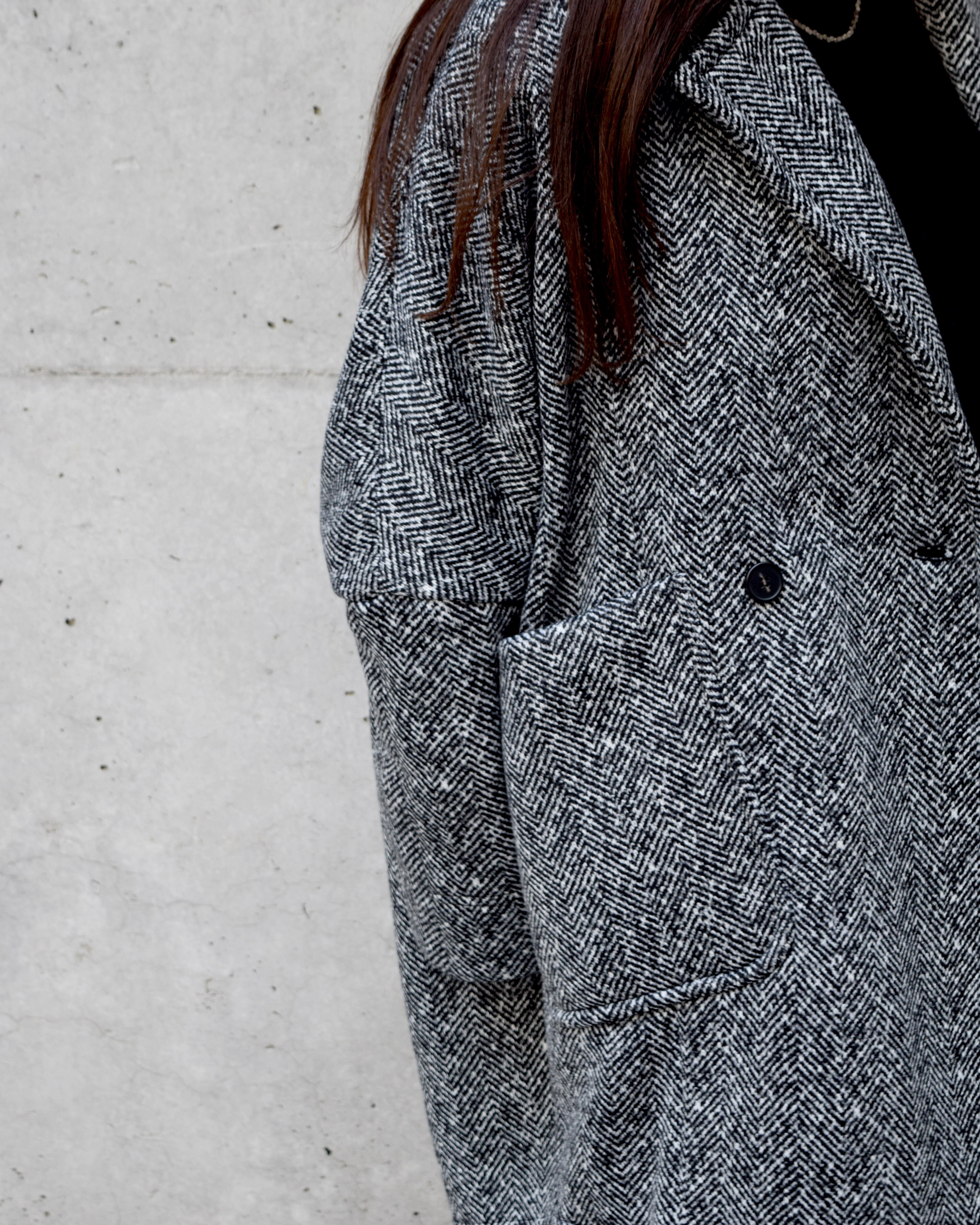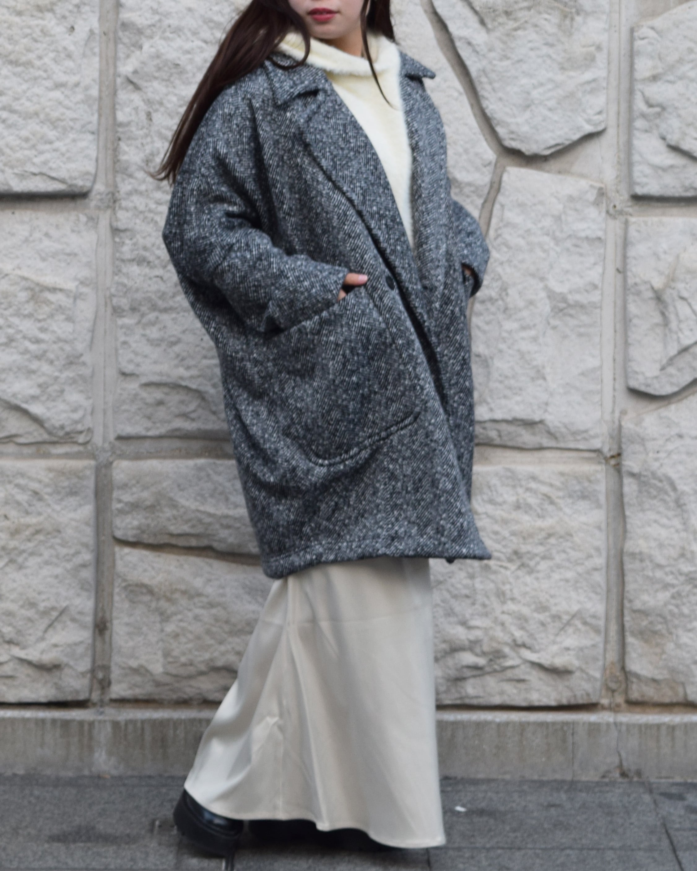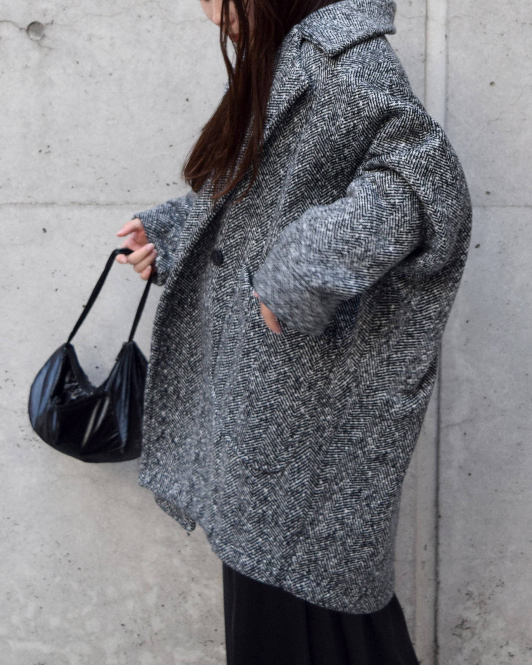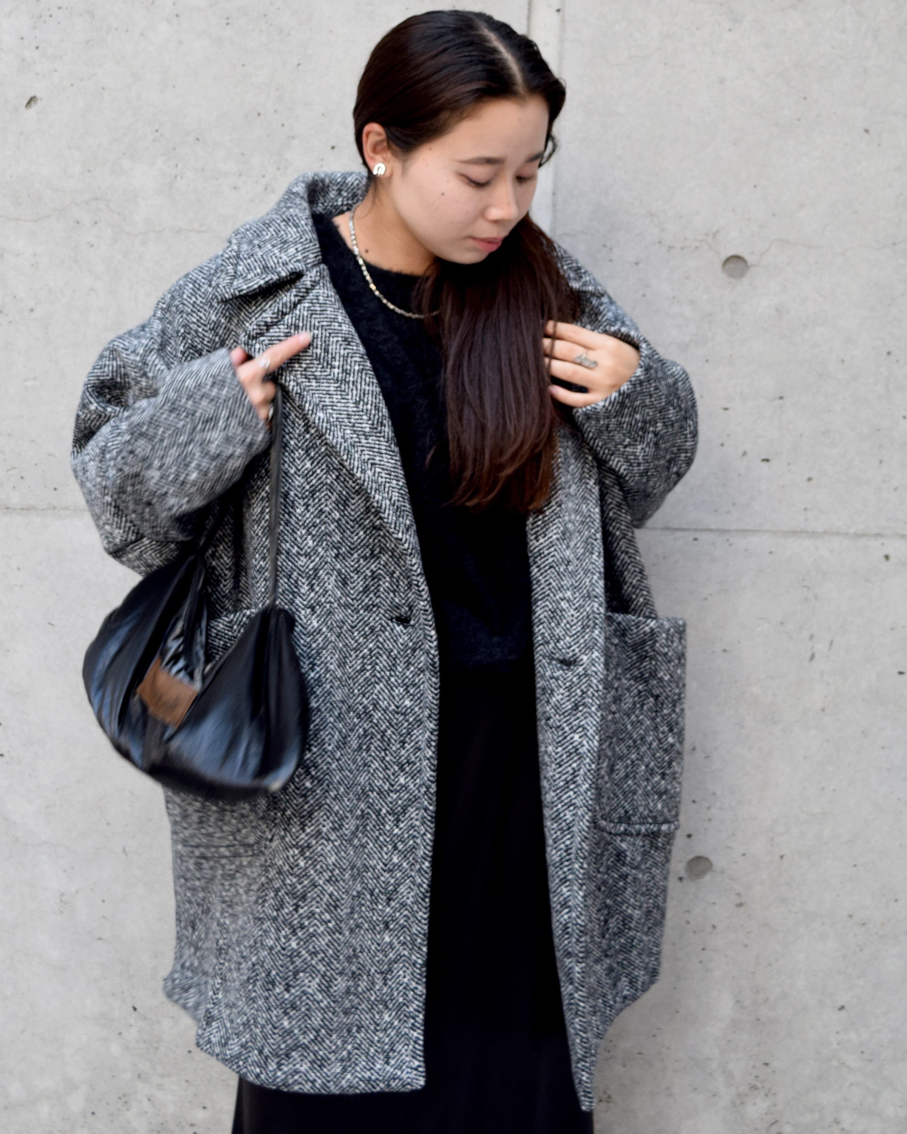 丸みのあるシルエットが女性らしく、身体を包み込むようなフォルムが魅力です。程よいボリューム感のラペルや大きめのポケットがアクセントになり、羽織るだけでこなれた印象に。軽量ながらも保温性が高く、寒い季節のデイリーアウターとして活躍します。