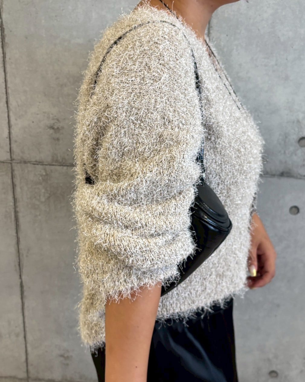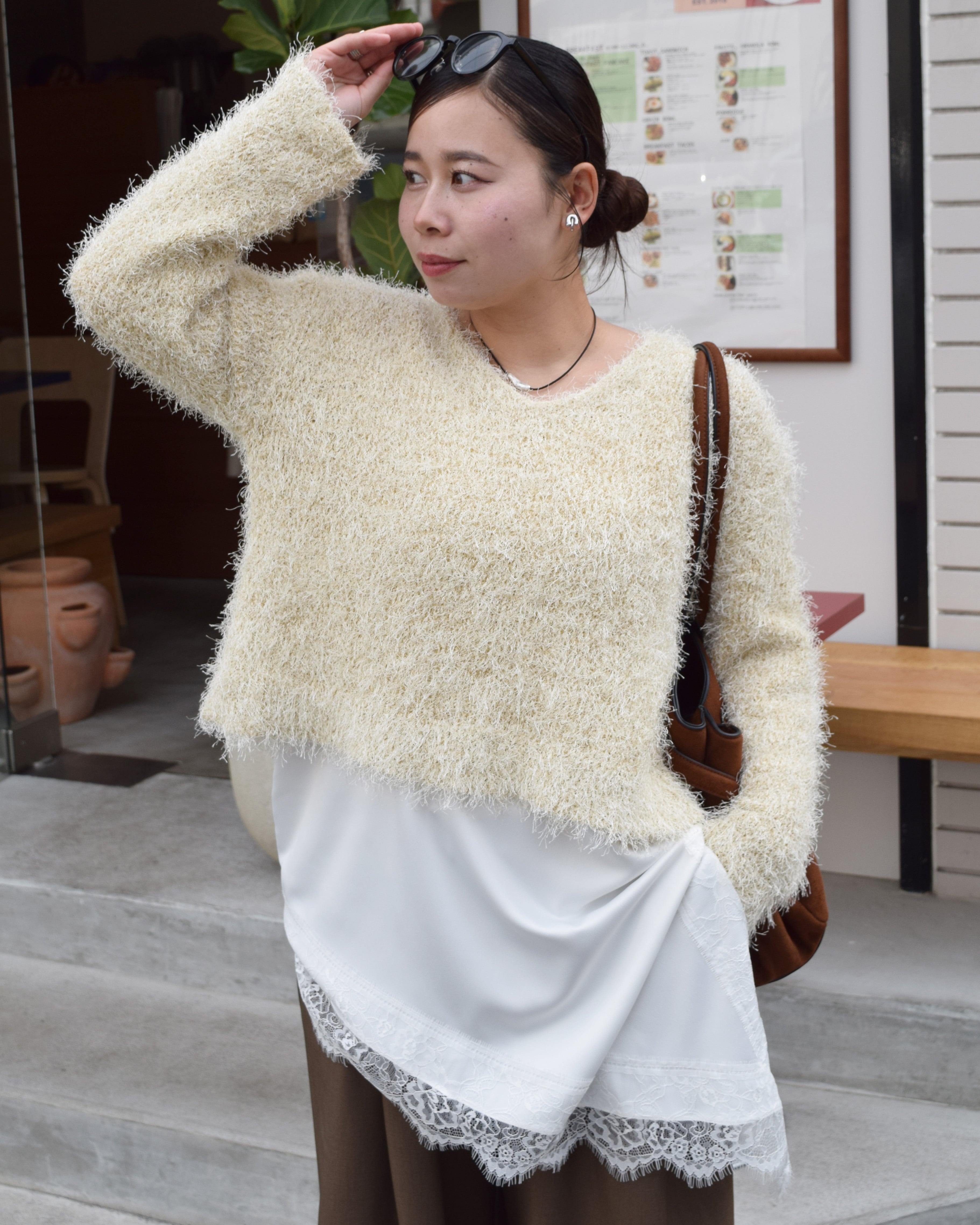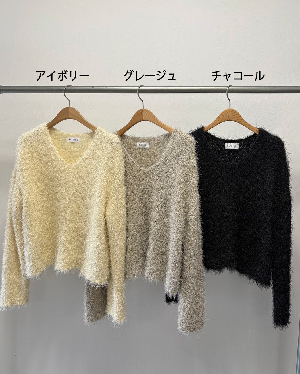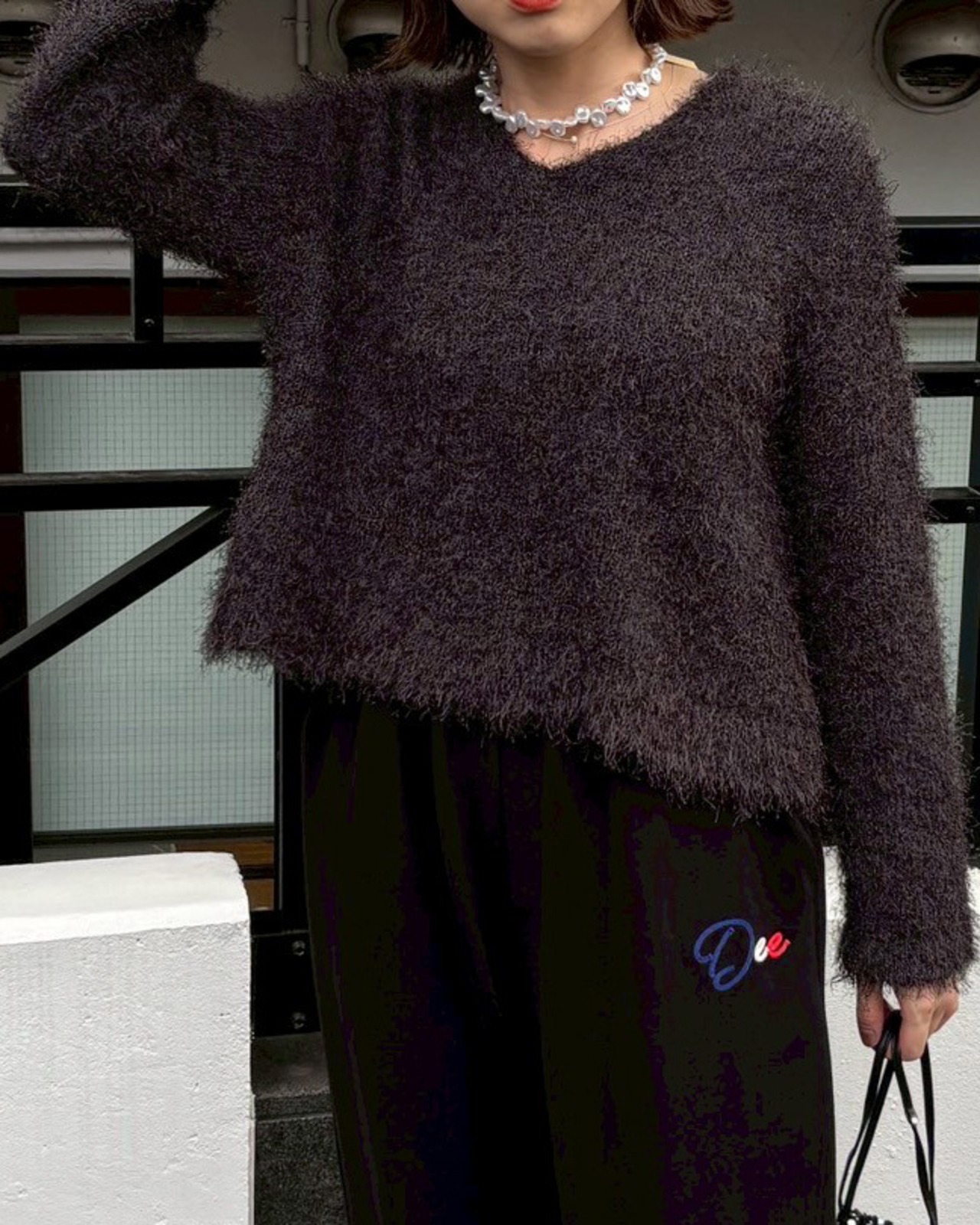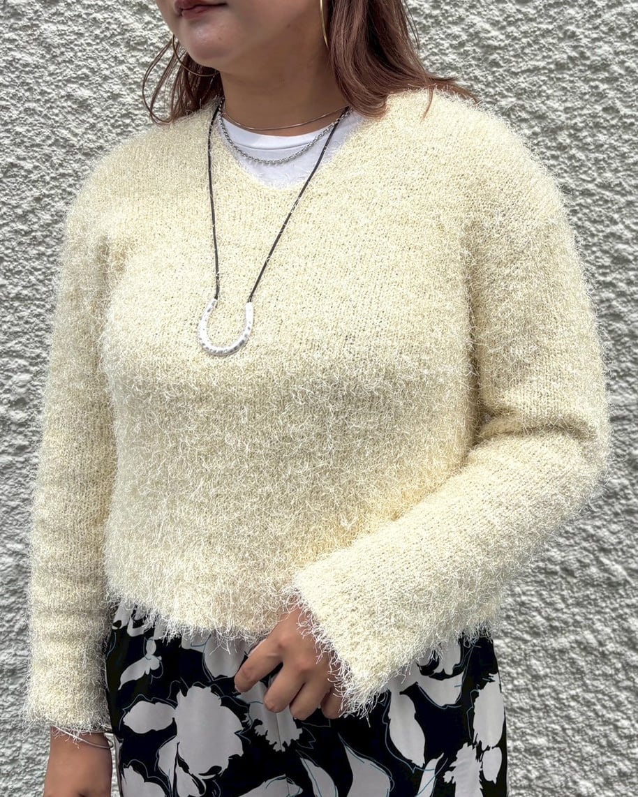 シャギー素材を使用したV開きニットトップス。軽やかな着心地ながら、毛足のある生地が柔らかなボリューム感を生み、女性らしいニュアンスをプラスします。