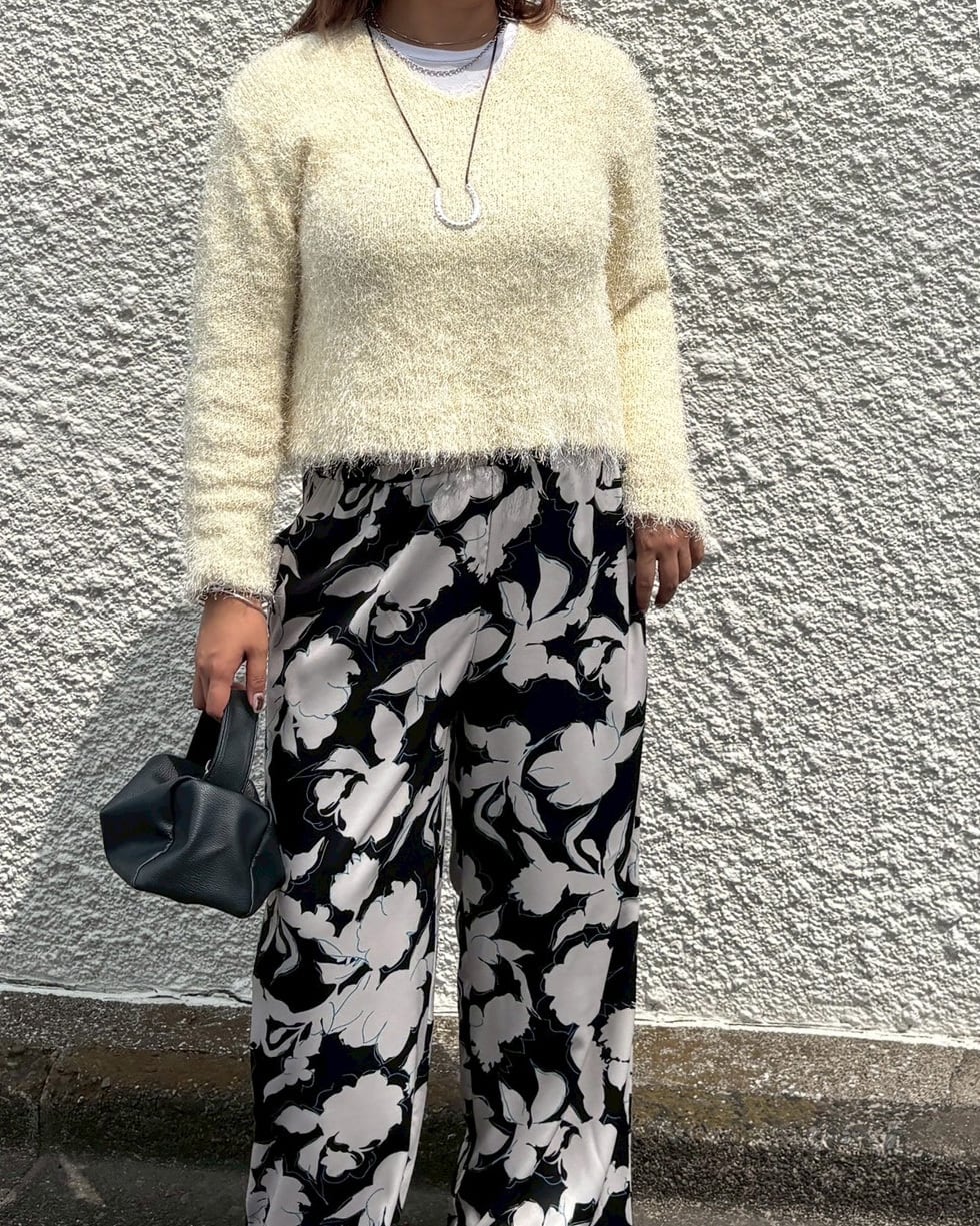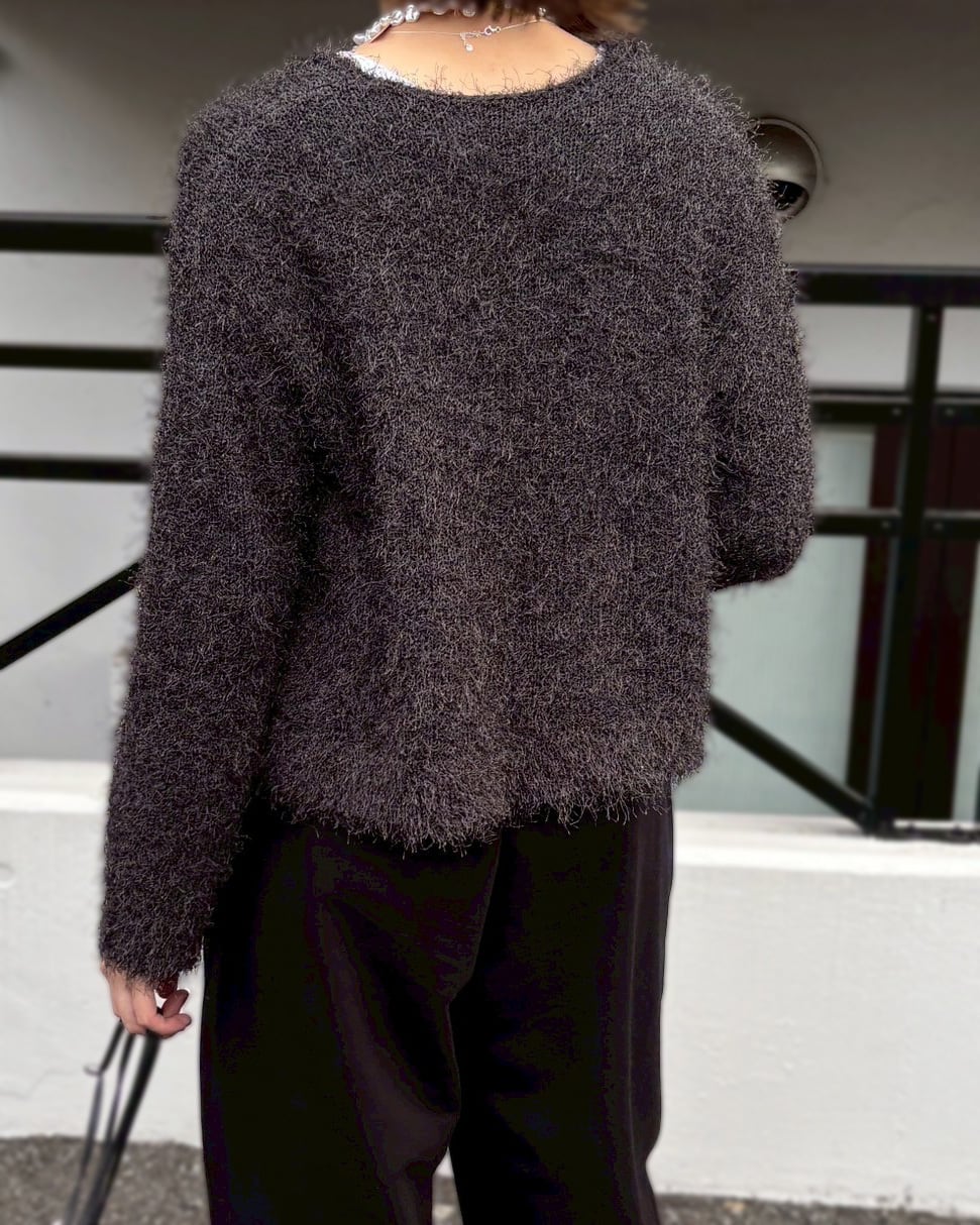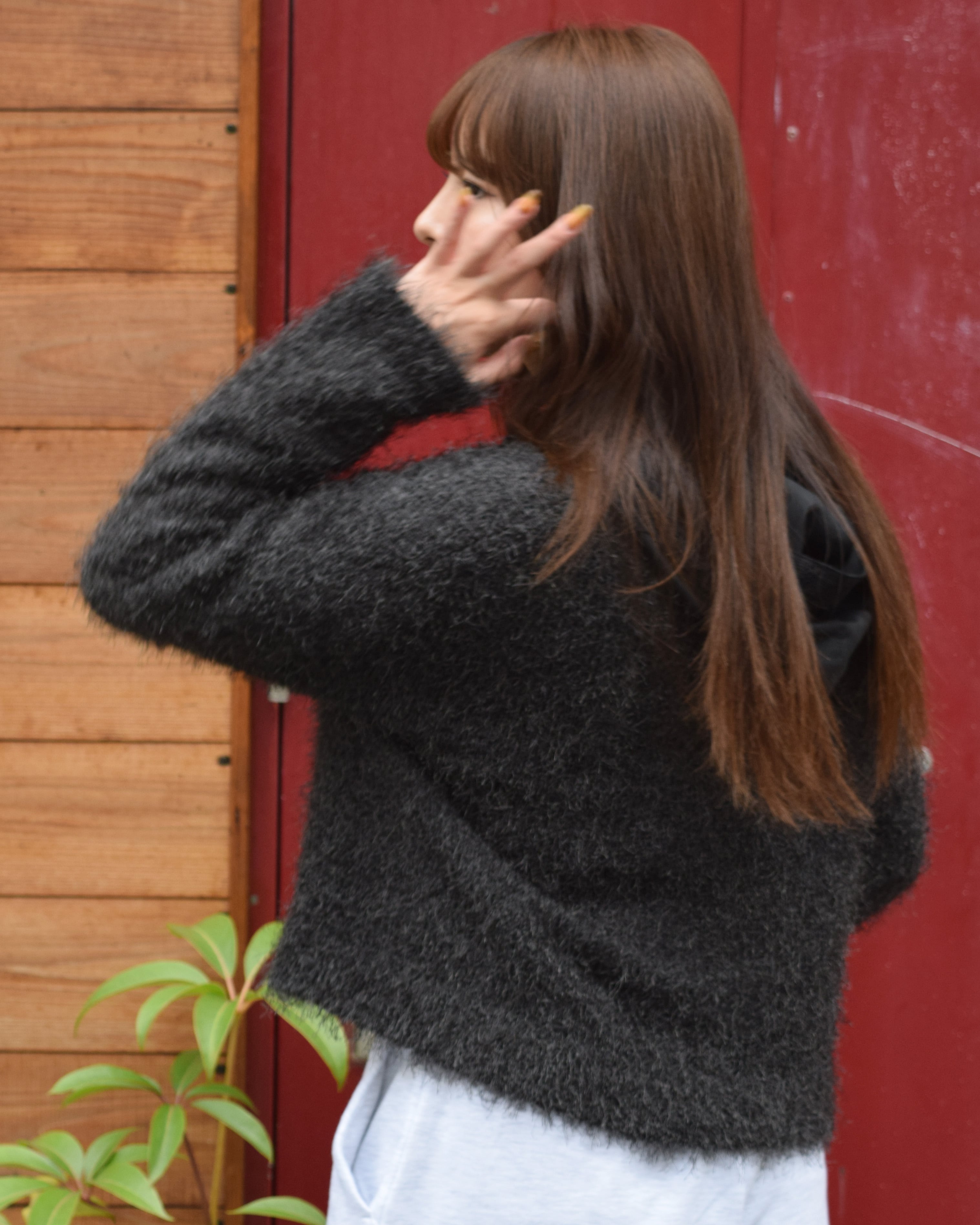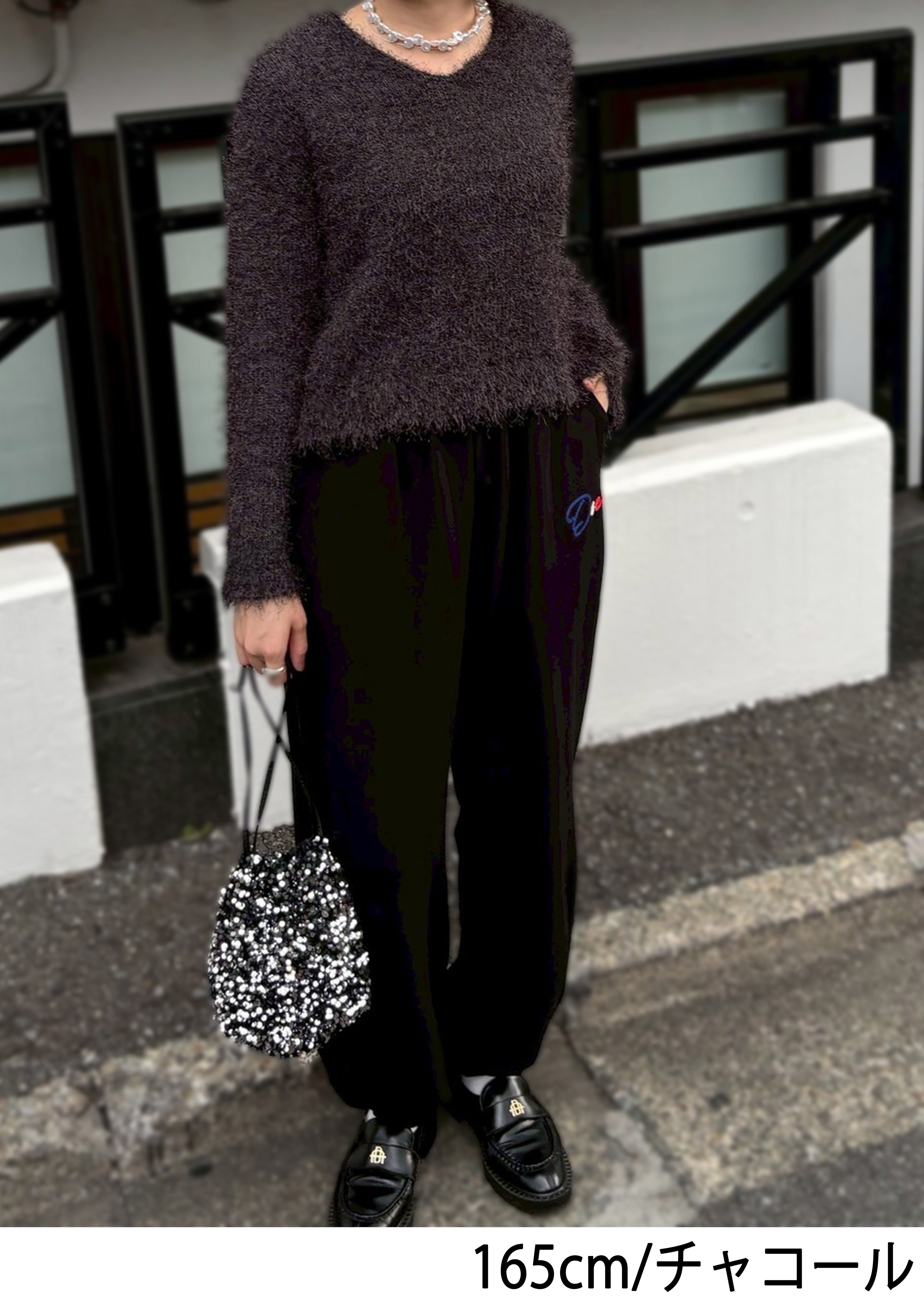 シャギー素材を使用したV開きニットトップス。軽やかな着心地ながら、毛足のある生地が柔らかなボリューム感を生み、女性らしいニュアンスをプラスします。