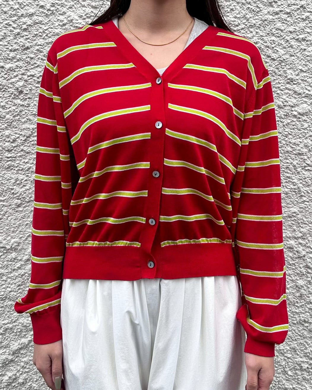 さらっと軽い素材を使用したボーダーカーディガン。ほんのり透け感のあるシアーニットで、見た目も着心地も涼やかな1枚です。Vネックのデザインが顔まわりをすっきり見せ、ボーダー柄でもカジュアルになりすぎず大人っぽい印象に。程よくコンパクトな着丈で、バランスが取りやすく、羽織としてもトップスとしても活躍します。