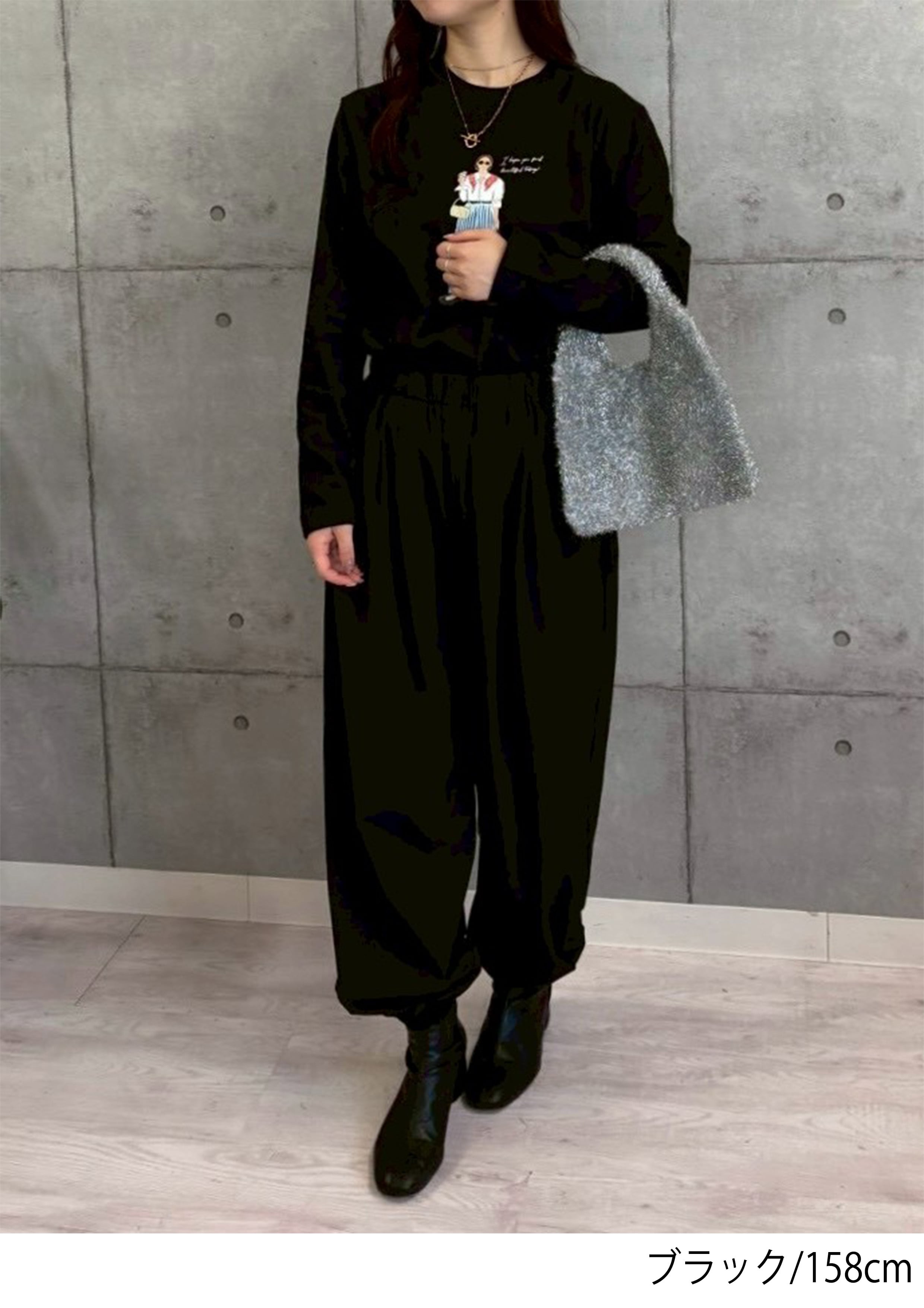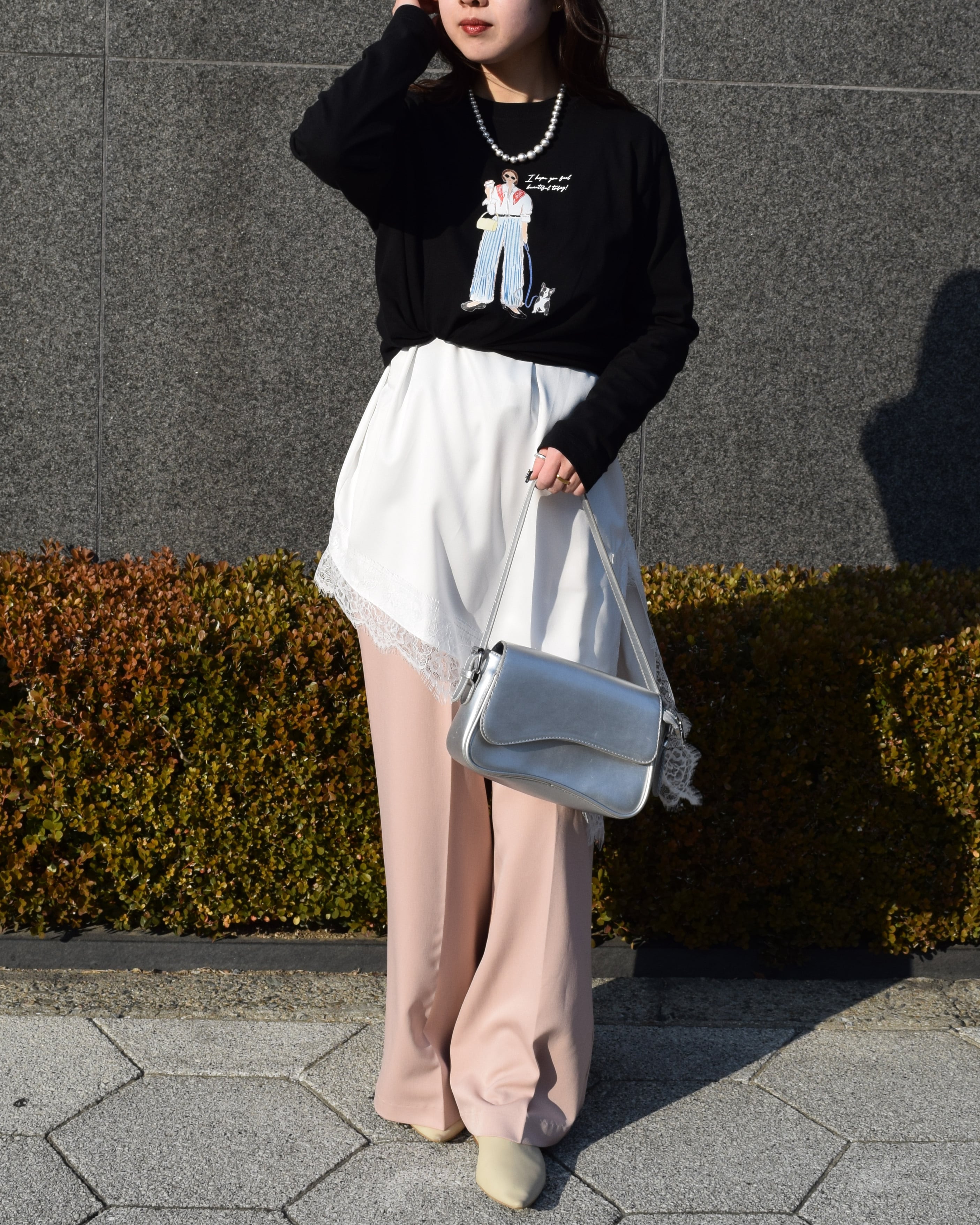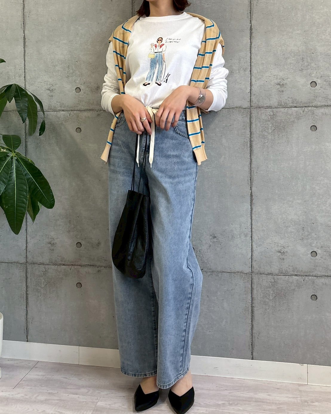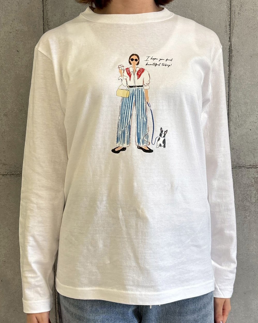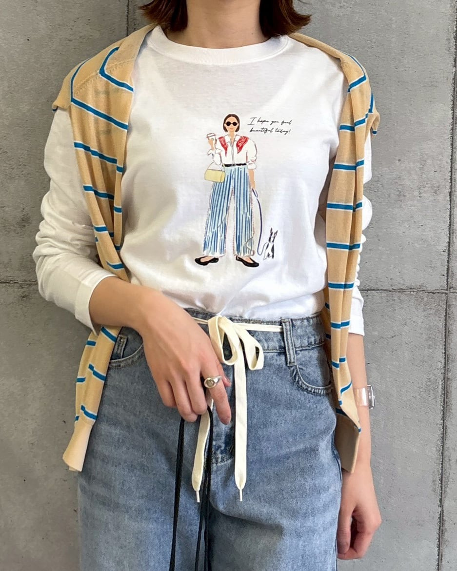 シンプルなスタイリングでも、プリントがアクセントになり存在感◎ジャケットやカーディガンのインナーとして取り入れれば、さりげないポイント使いにもおすすめです。