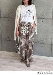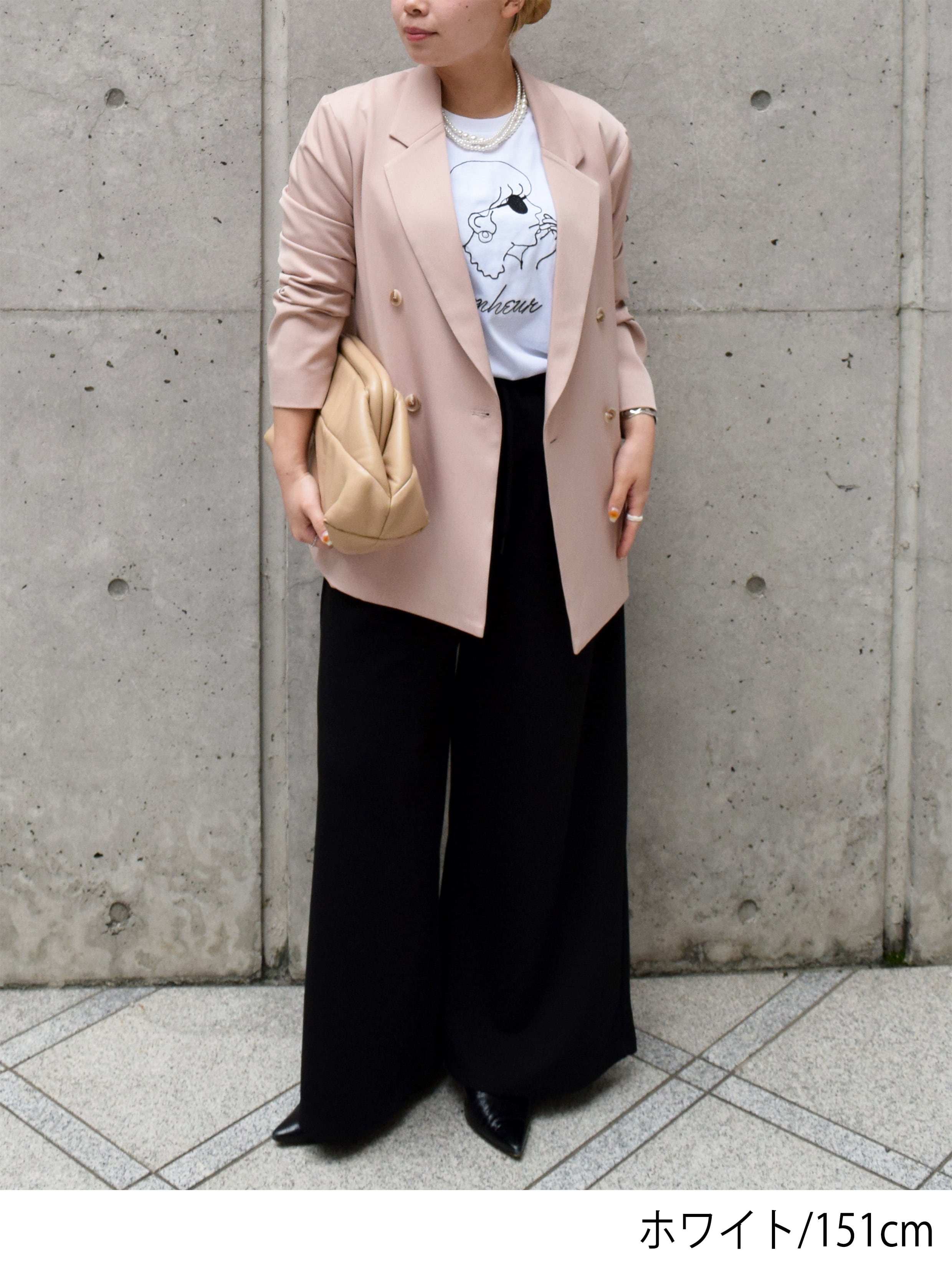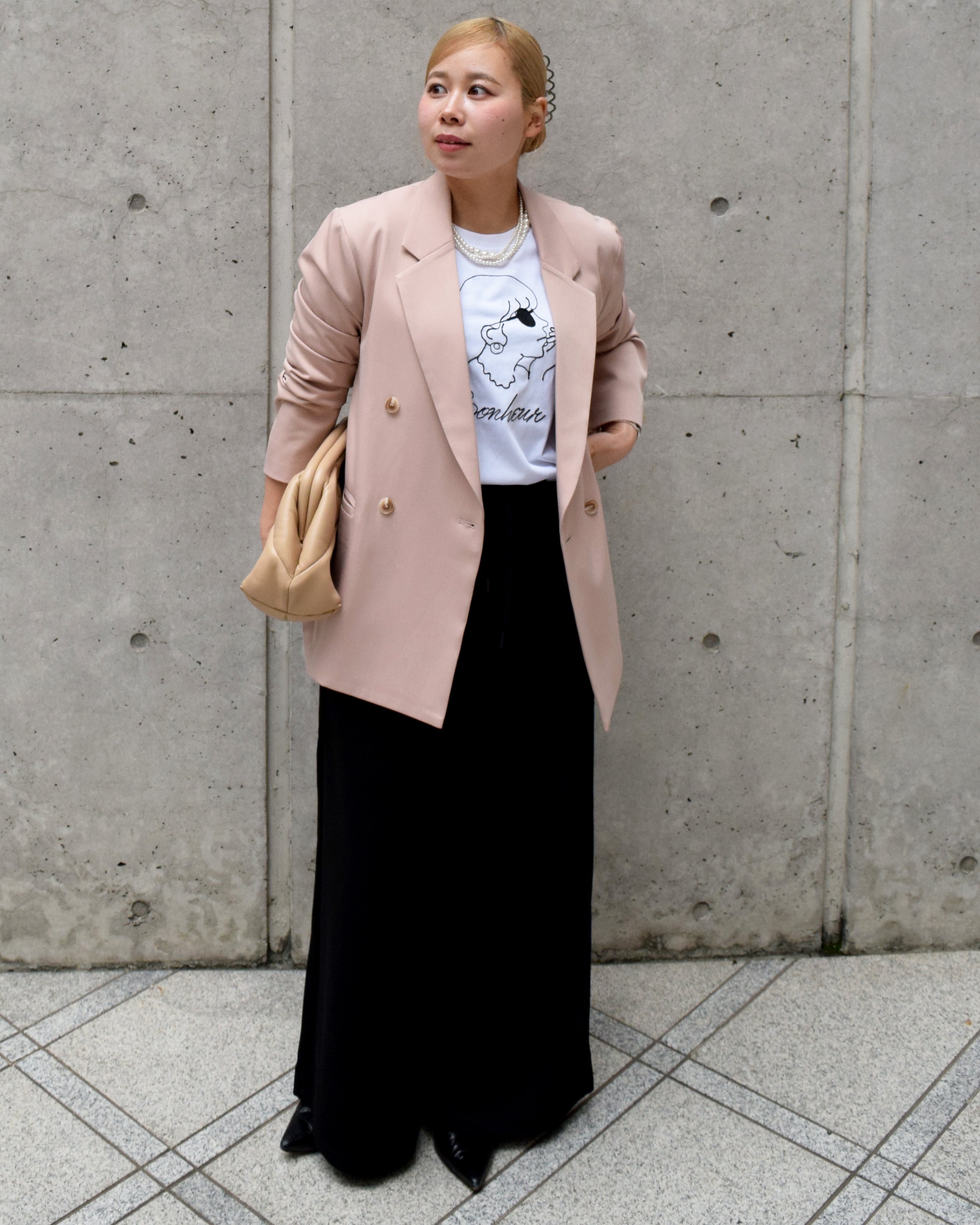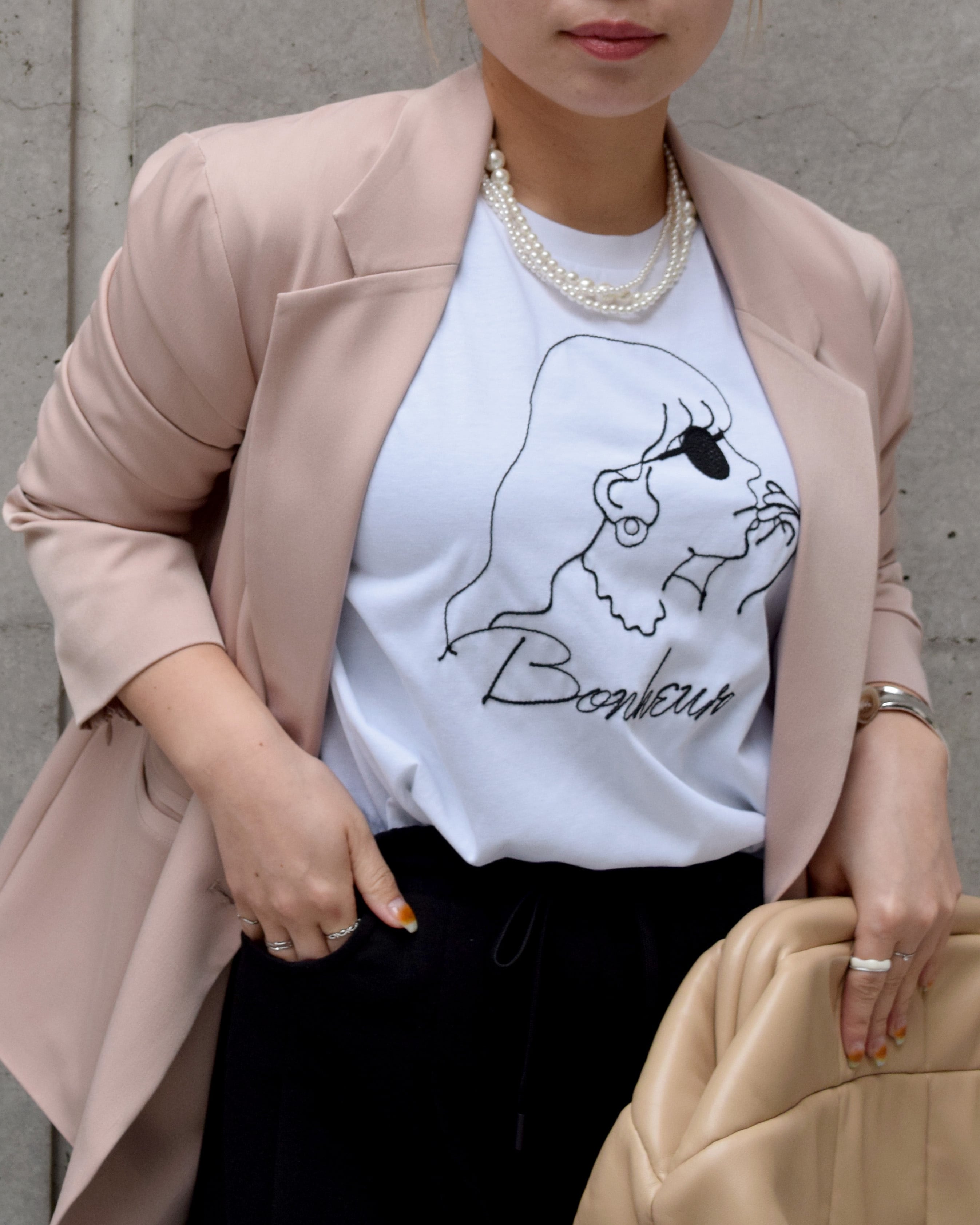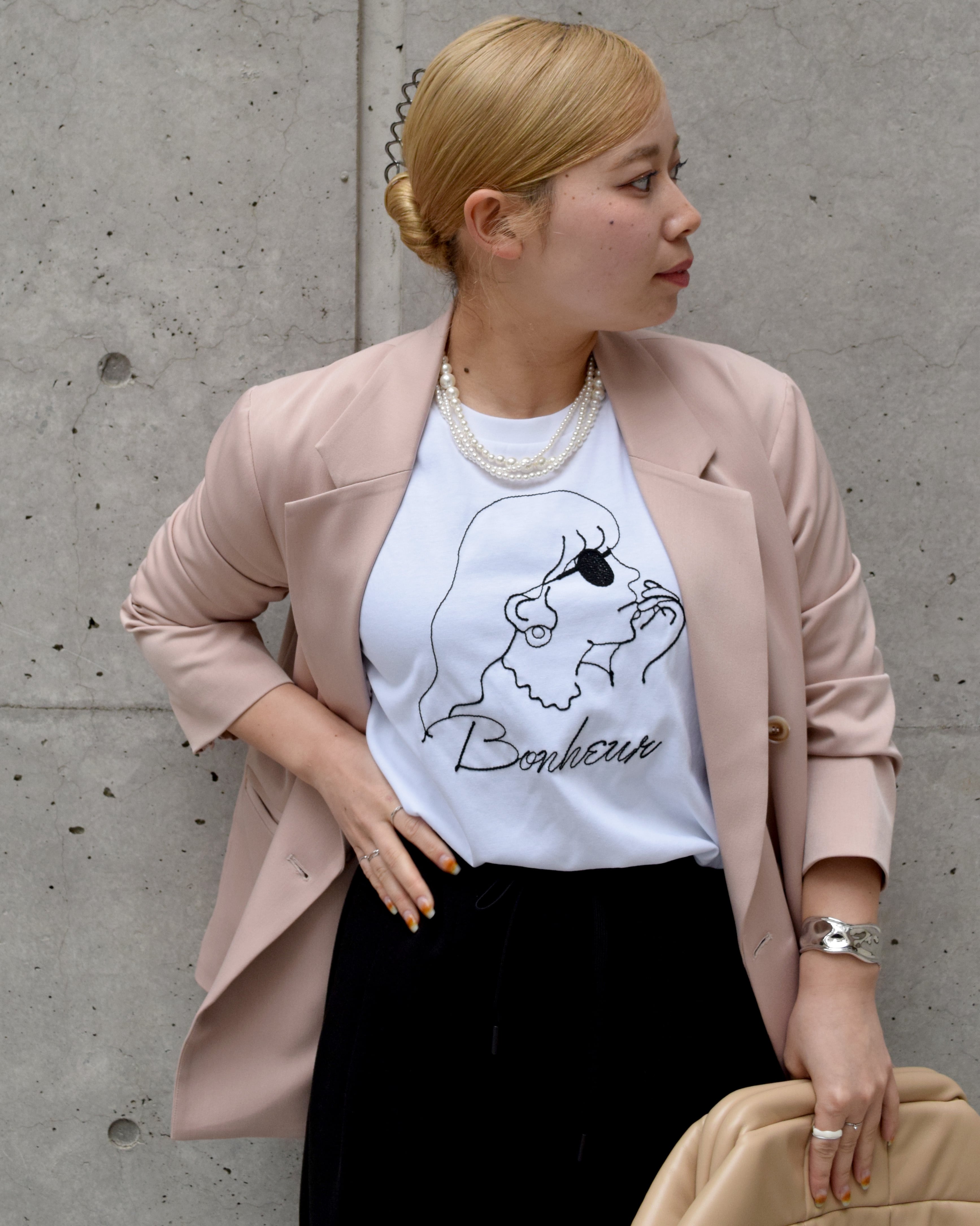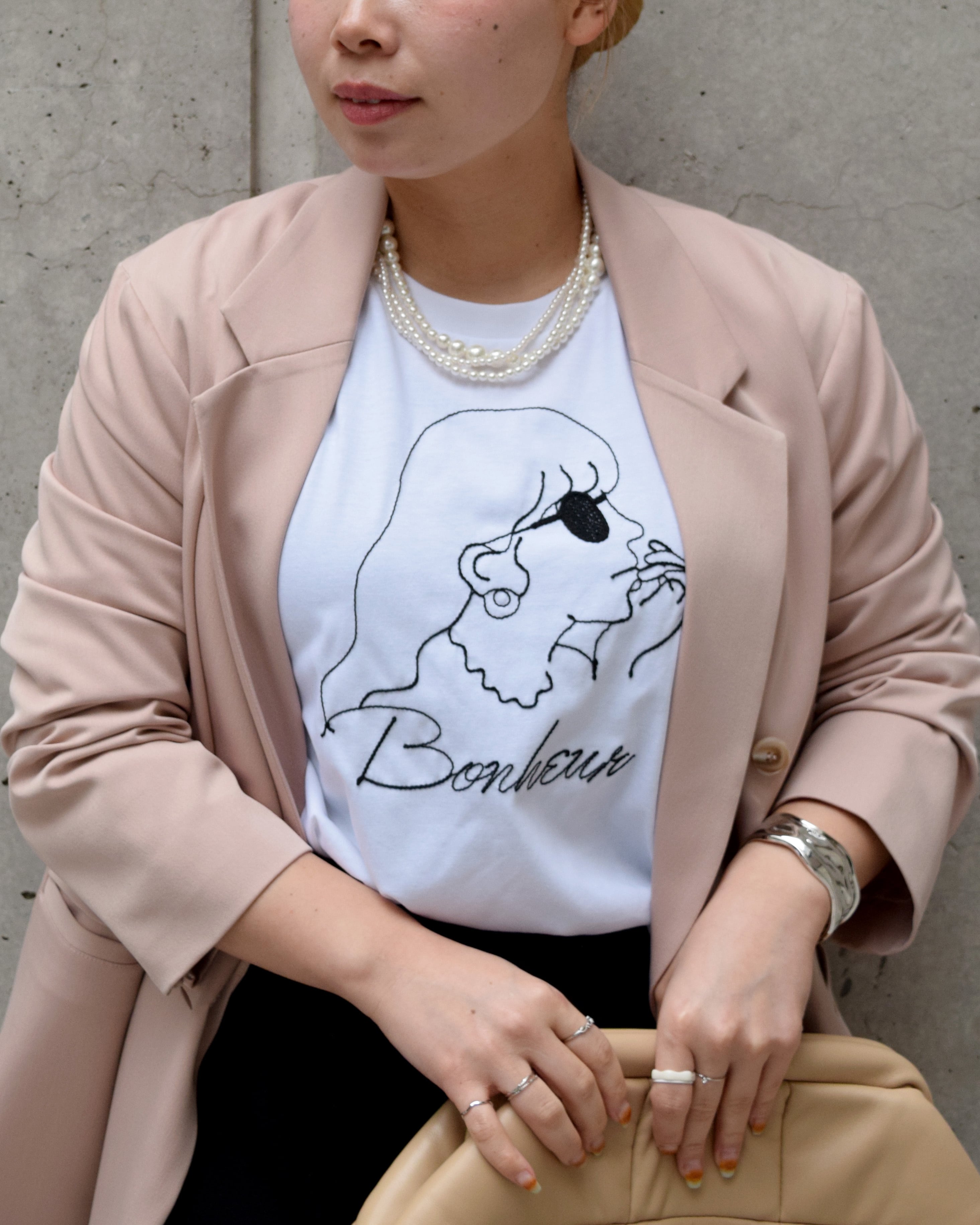 1枚で主役になるTシャツなので、ボトムスはシンプルにまとめるのはもちろん、ジャケットを羽織って刺繍をチラ見せするのもおすすめのスタイリング◎