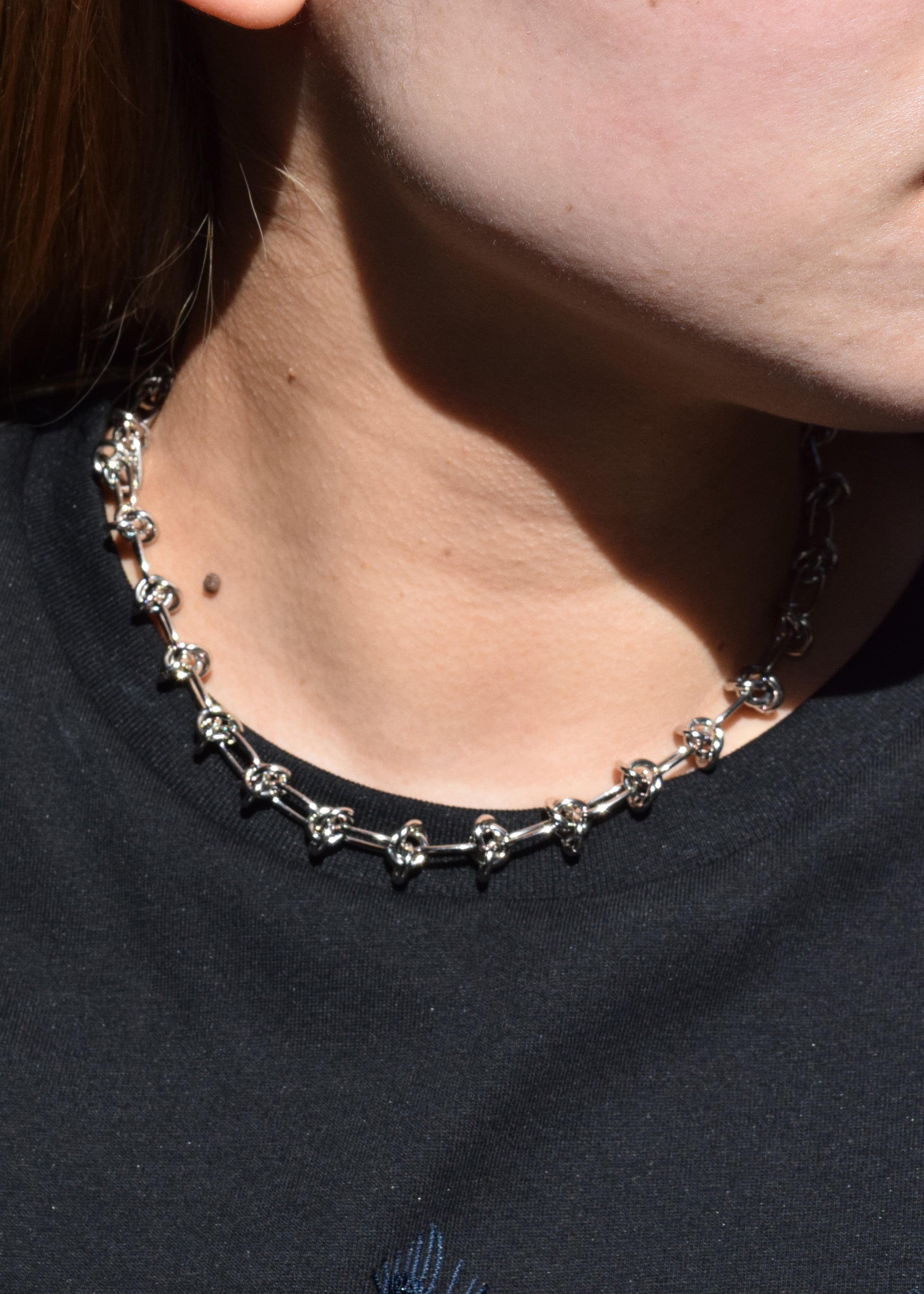 存在感のあるチェーンを使用したショートネックレス。