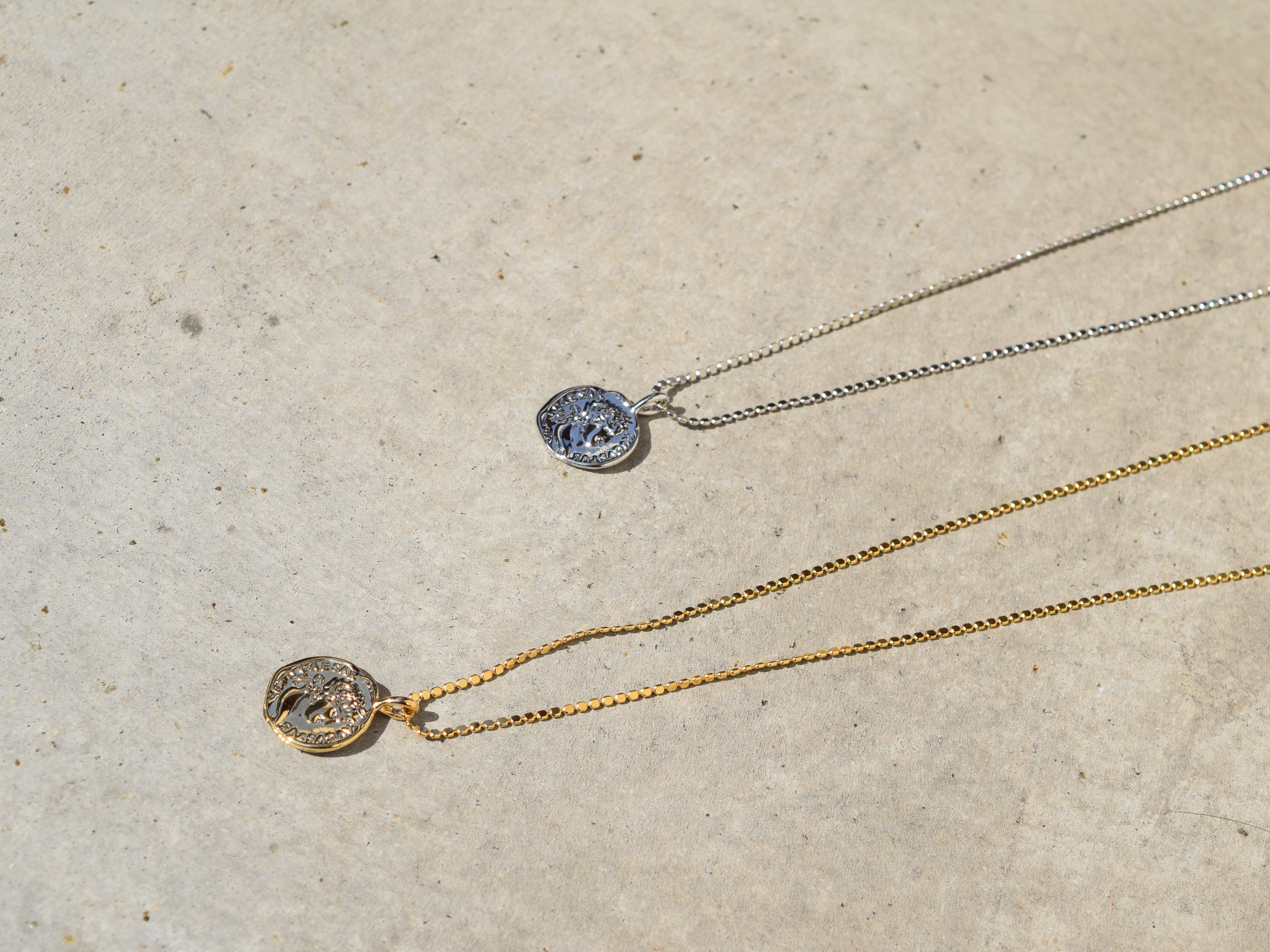 シンプルなチェーンに程よいサイズ感のコインが映え、洗練された印象に仕上げています。