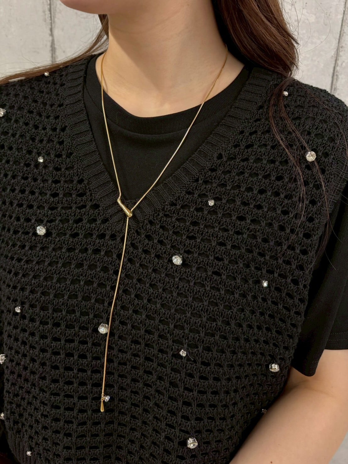 長さやバランスを自由に調整できるラリエット仕様で、その日の気分やコーデに合わせたアレンジも楽しめます。