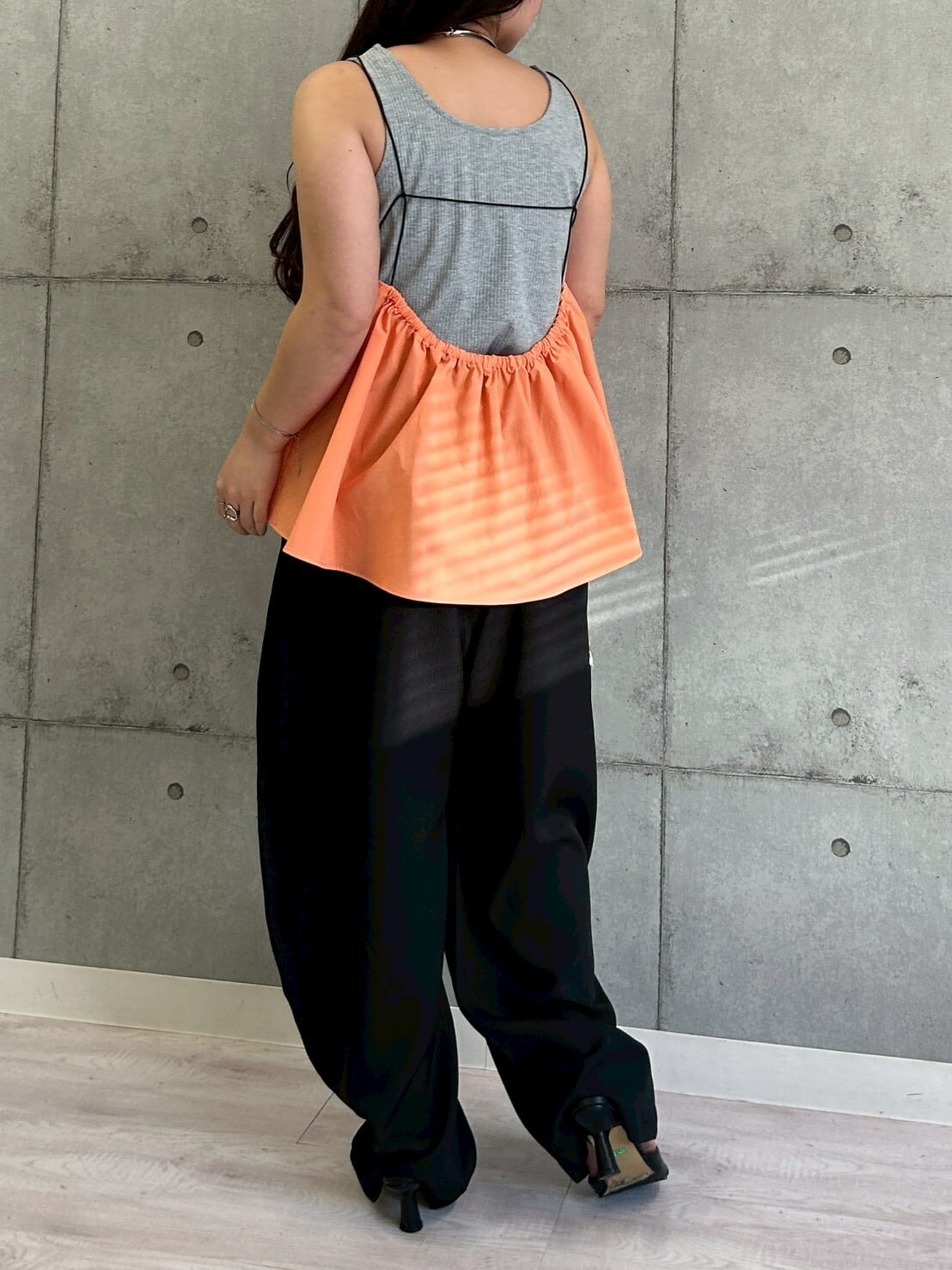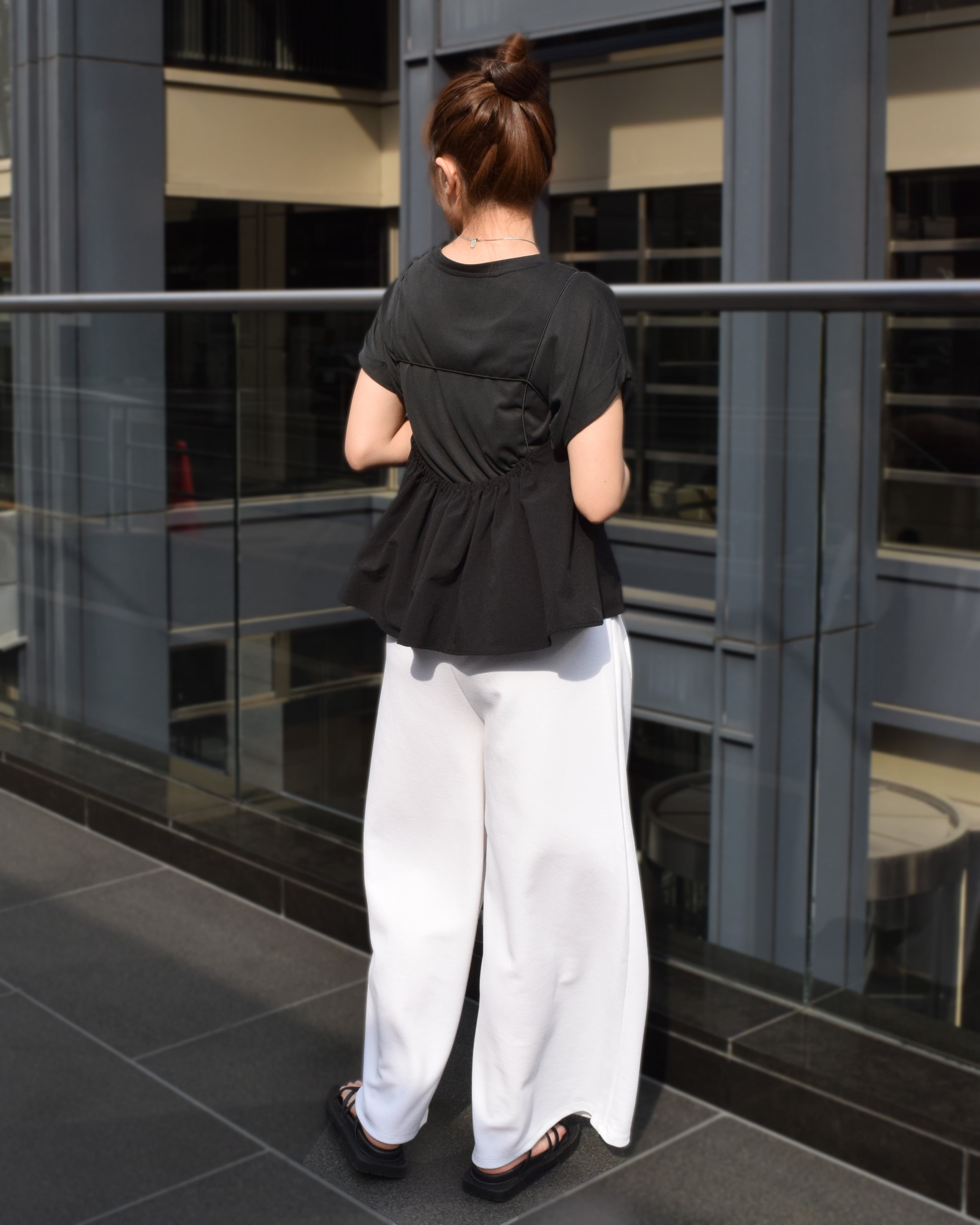 バックスタイルはギャザー切替デザインになっており、動くたびにふんわり広がる立体感がポイント。