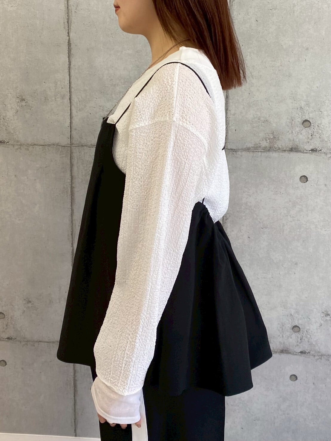 Tシャツやシアートップスとのレイヤードで、旬なスタイリングが完成。