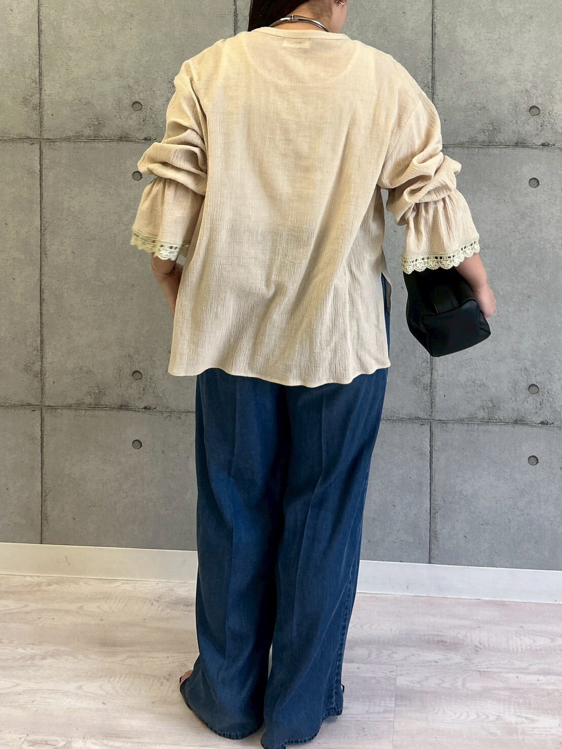 レースブラウスやシアートップスを合わせて女性らしく仕上げるのもおすすめ。